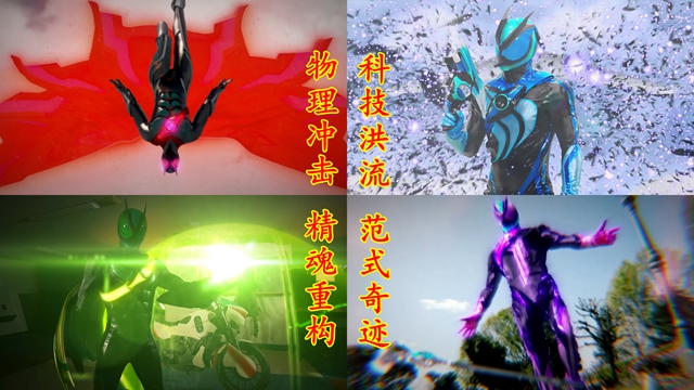 假面骑士ZZZ的七大基础衍生形态,分别是红色的物理冲击,肉体强化类型;蓝色的科技洪流,操纵大气和善用科技;绿色的精魂重构,擅长治疗和防御;紫色的范式奇迹,操纵重力和改变体型大小。
