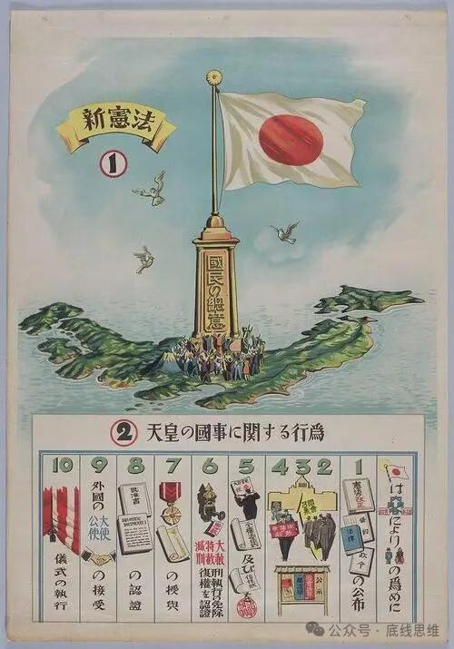 日本对战后新宪法的宣传画,展现的国土范围中已经不包括琉球。