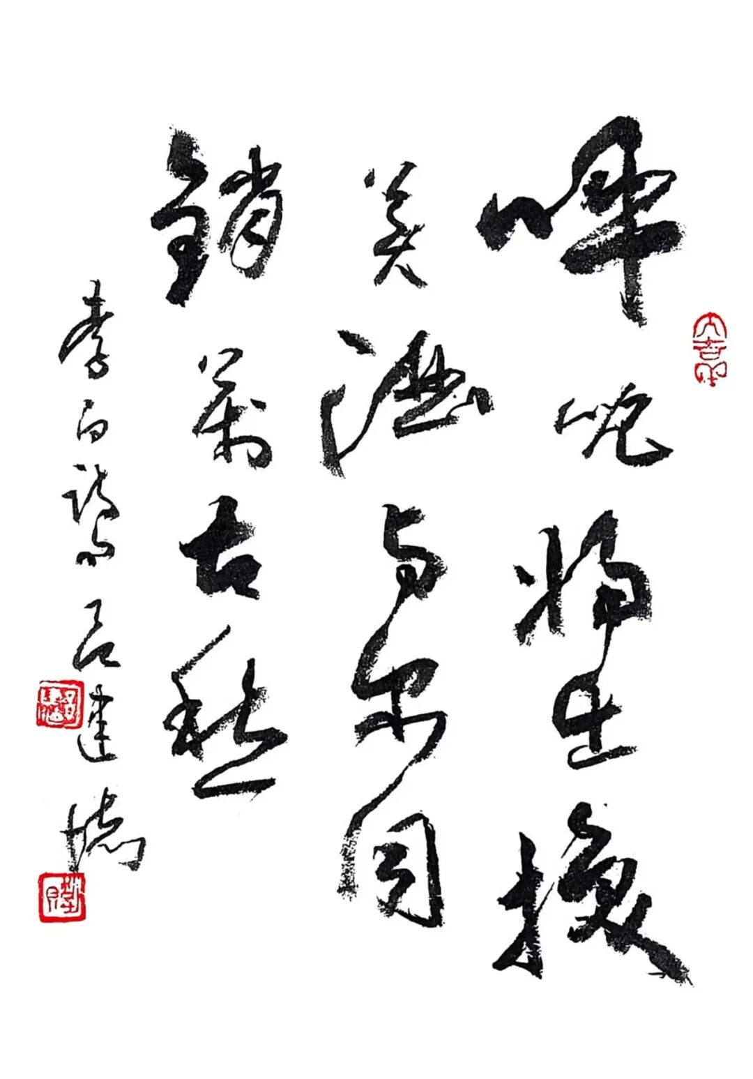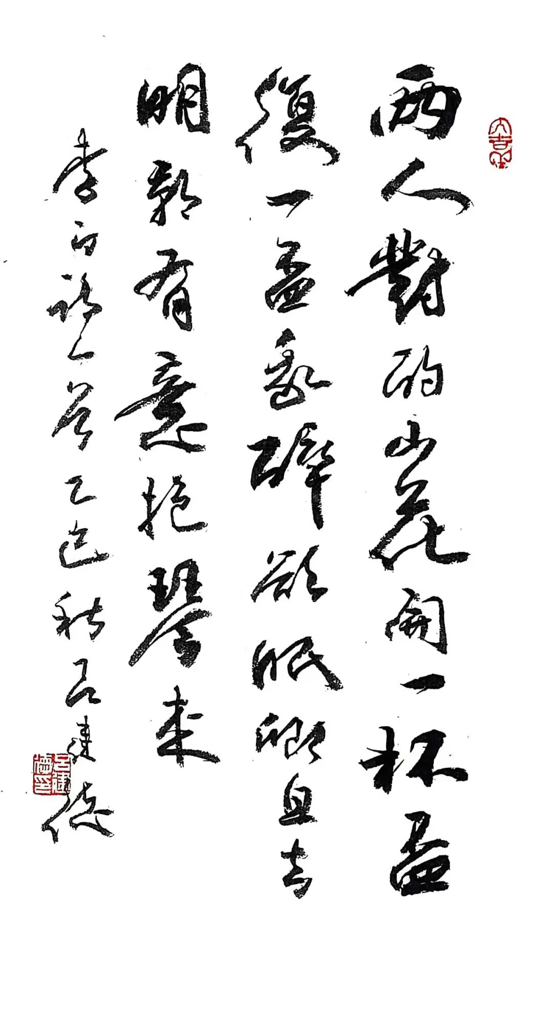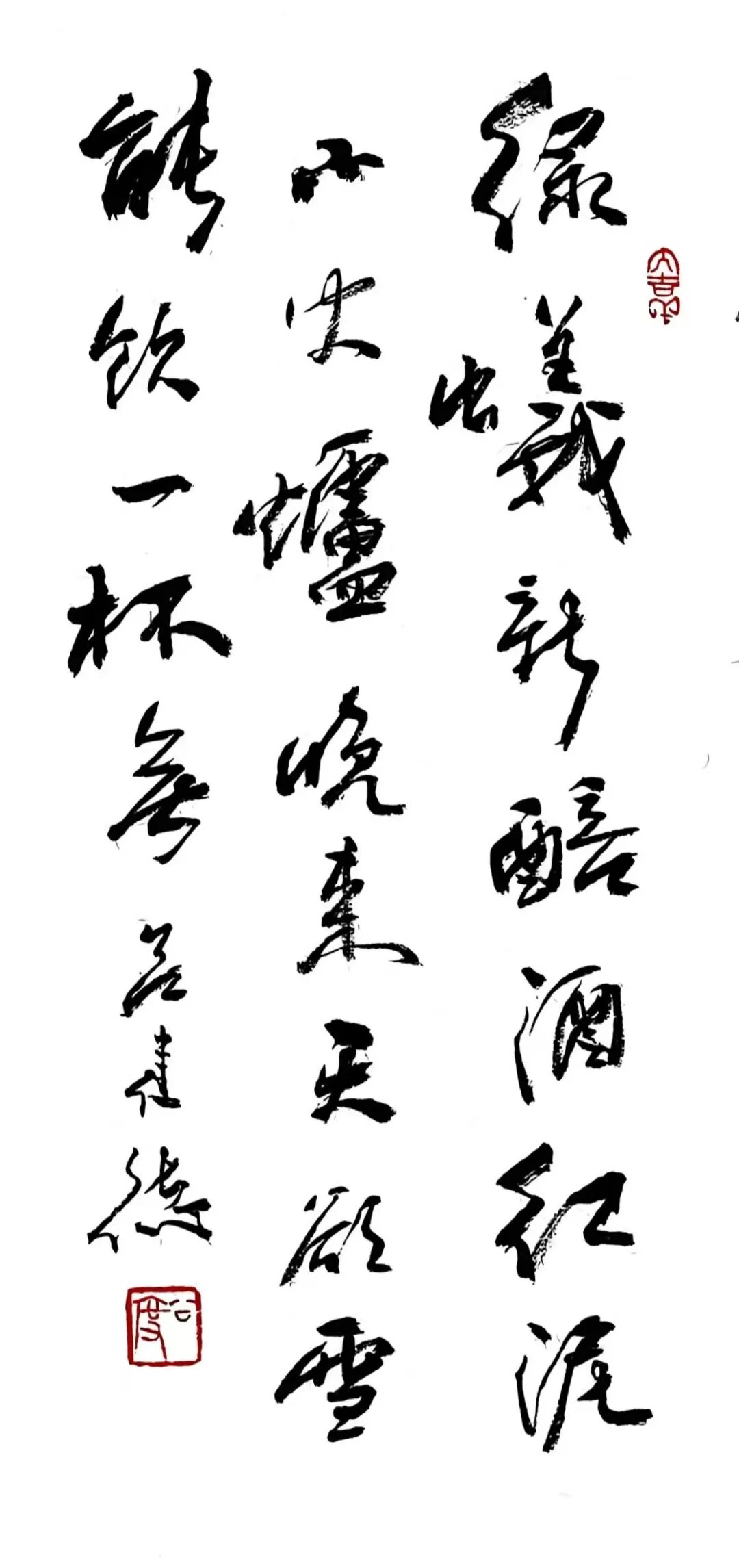 “绿蚁新醅酒”的“新”“醅”处理得润而不腻,浓墨铺陈后以干笔微扫,保留颗粒感;“红泥小火炉”转而以枯润对峙,笔画边缘的飞白像炭火的跳跃。章法上,他收紧字距、放松行距,使热量在列与列之间扩散,营造围炉之暖。至“晚来天欲雪,能饮一杯无”,留白陡增,墨色转清,冷与暖的气候在一幅中并置——这不是简单的“写诗”,而是用墨色调试温差,用留白写风雪。