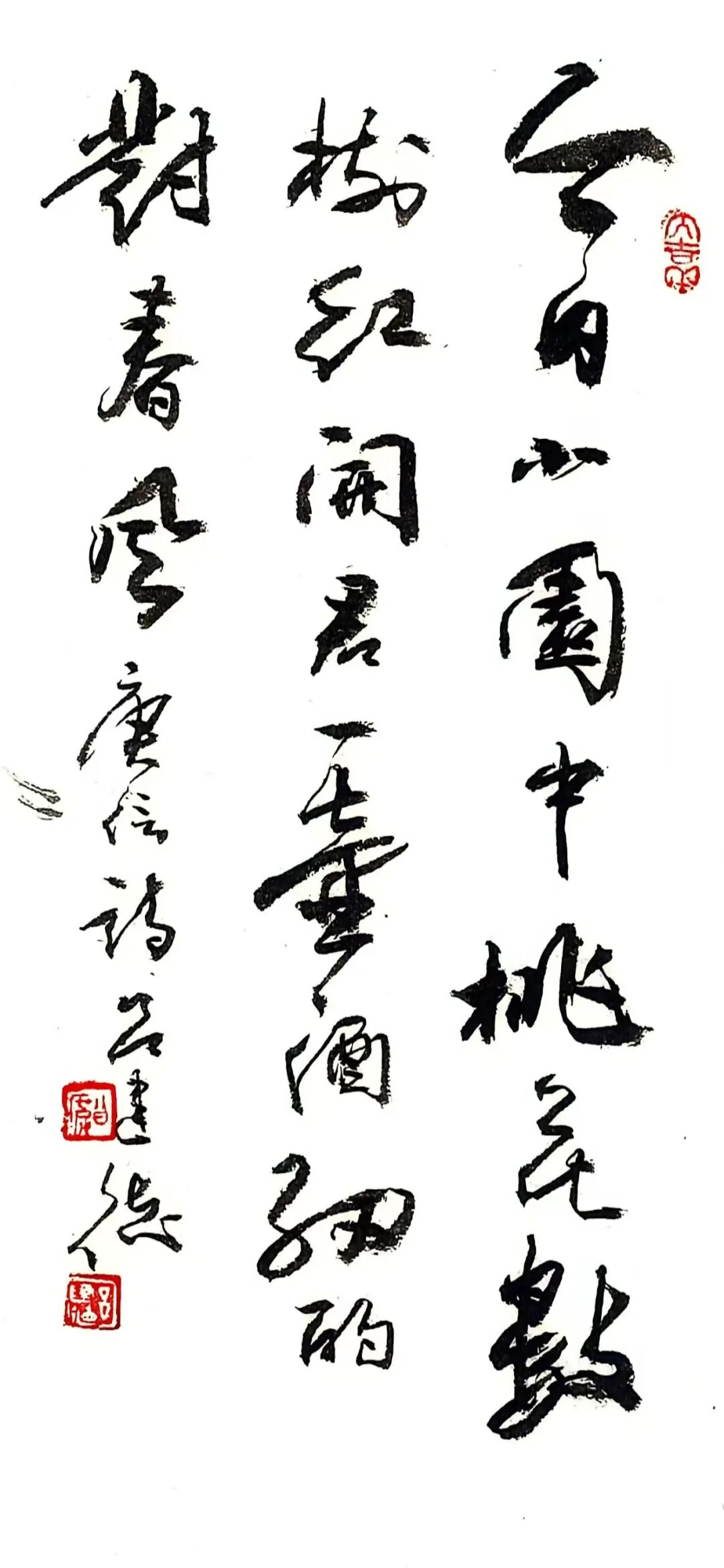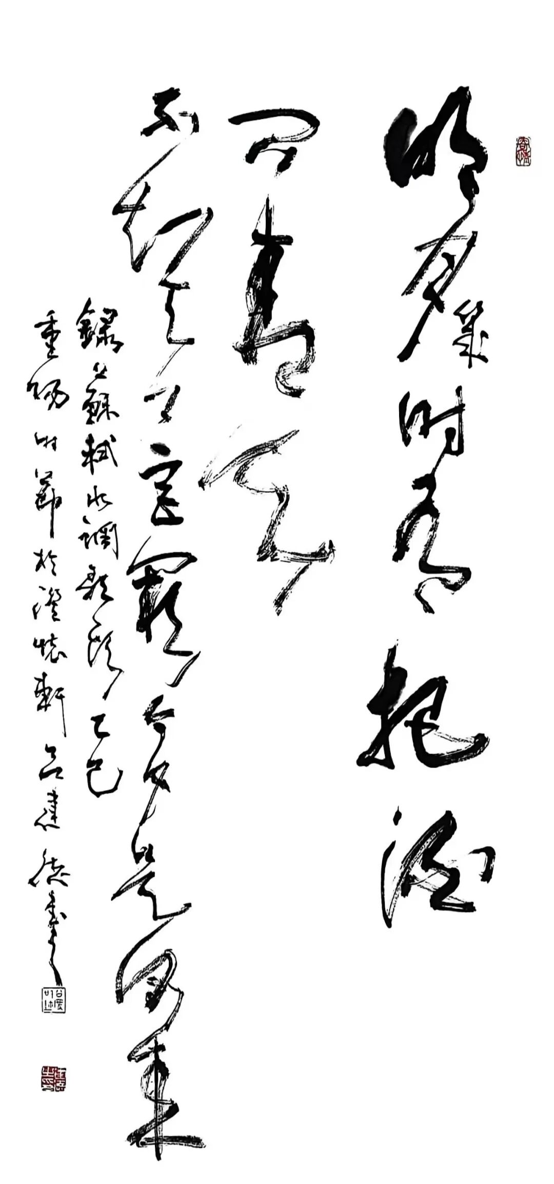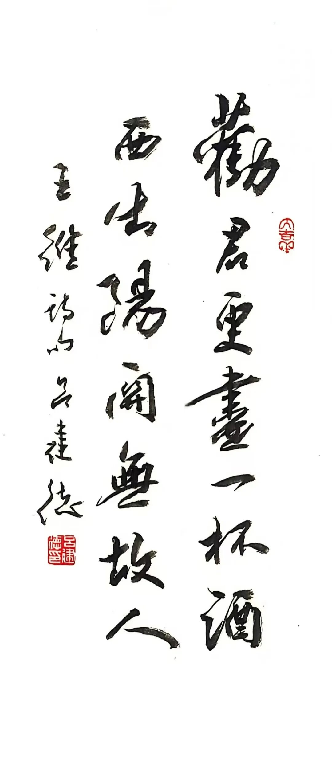“绿蚁新醅酒”的“新”“醅”处理得润而不腻,浓墨铺陈后以干笔微扫,保留颗粒感;“红泥小火炉”转而以枯润对峙,笔画边缘的飞白像炭火的跳跃。章法上,他收紧字距、放松行距,使热量在列与列之间扩散,营造围炉之暖。至“晚来天欲雪,能饮一杯无”,留白陡增,墨色转清,冷与暖的气候在一幅中并置——这不是简单的“写诗”,而是用墨色调试温差,用留白写风雪。