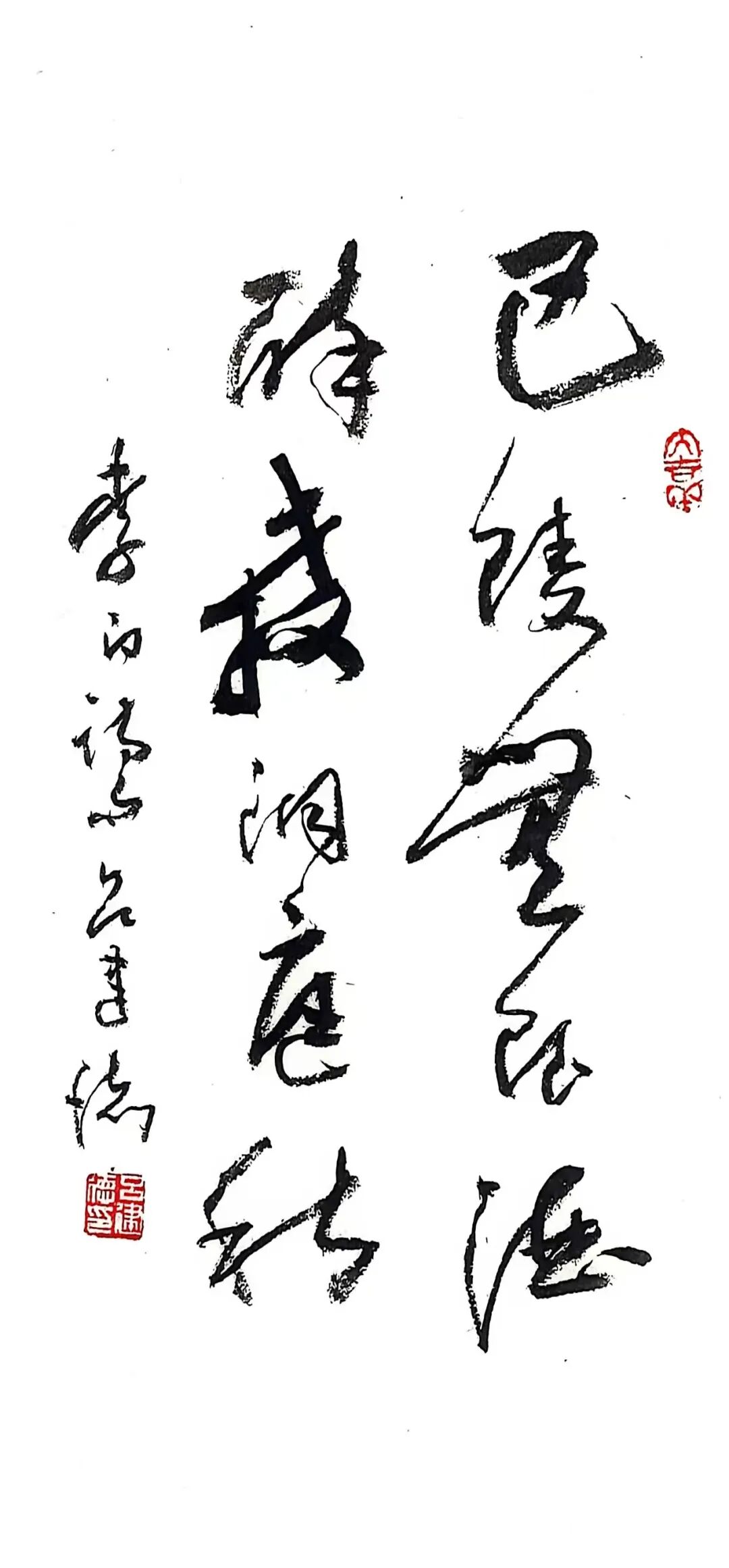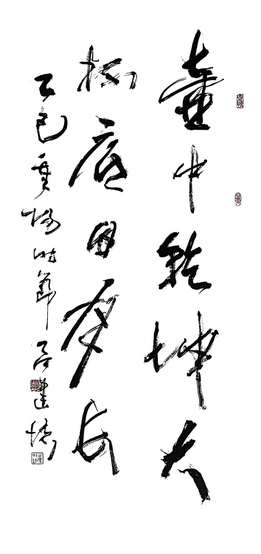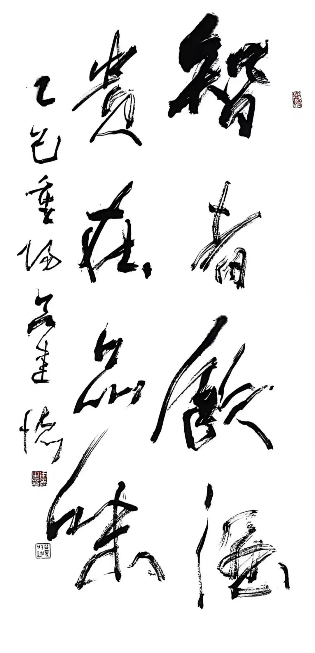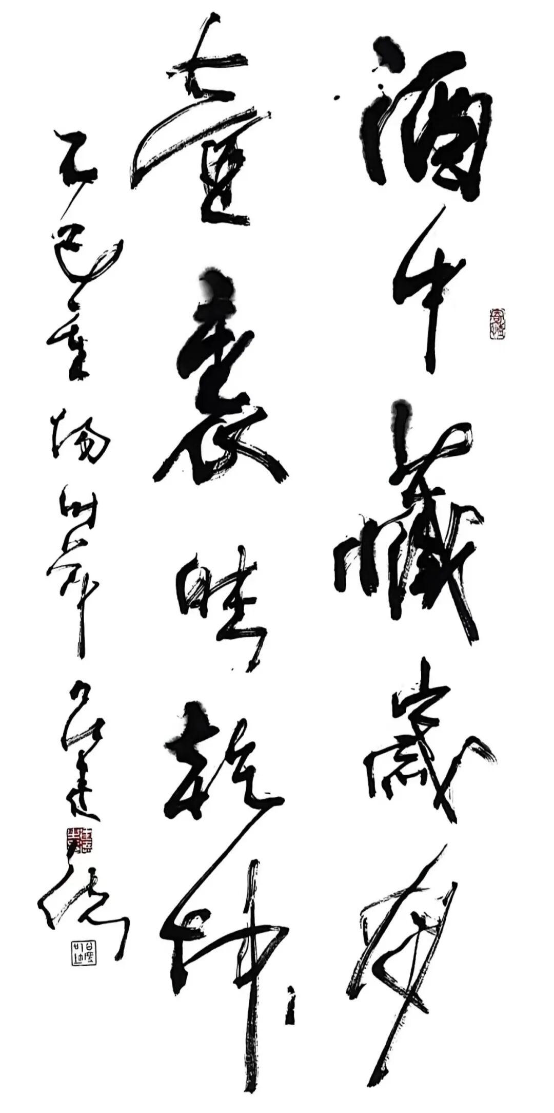 此幅的线条最为纵肆,竖势大开,横画简练,整体像一只被拔地托起的“壶嘴”。他在关键转折处反复“回锋藏锋”,让笔势拐弯不失骨力。章法上,以几处空阔的“无字区”形成“壶胆”,红印如壶钮点睛。酒壶只是借喻,真正要说的,是书写在当代依旧可以承载宇宙观:乾坤在掌,日月在怀,线条是人与世界的通电之线。