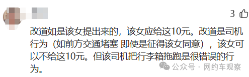 也有人认为先要搞清楚到底是谁提出该路线,如果改道是乘客提的,那乘客就应该出这10块钱,司机错就错在不该把行李箱拖跑。