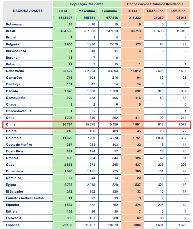 报告显示,中国以30,734人的居留数量排名第7位,成为葡萄牙社会中最活跃的亚洲移民群体之一,仅次于印度与尼泊尔。