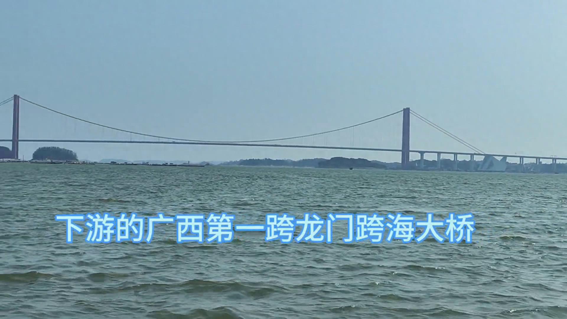平陆运河钦州湾茅尾海下游的广西第一跨龙门跨海大桥上游方向平陆运河航道运河施工船只上方中铁广州局平陆运河锚地施工,设36个5000吨级锚位,可系泊72-78艘船。采用墩式系泊布置3排共75个靠船墩,两侧均可停靠,属大型海侧锚地,面积约0.66平方公里,供船舶在入海段候泊或编队。上游方向的沙井北部湾大桥和沙井岛。