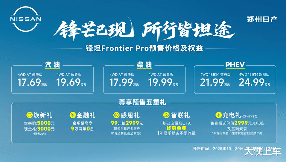 郑州日产锋坦Frontier Pro正式开启预售。作为日产首款在中国设计、研发并生产的全球皮卡,锋坦不仅承载着郑州日产从“本土执行者”向“全球定义者”转型的雄心,更标志着中国皮卡工业正式迈入“定义全球标准”的新时代。中国的!世界的!