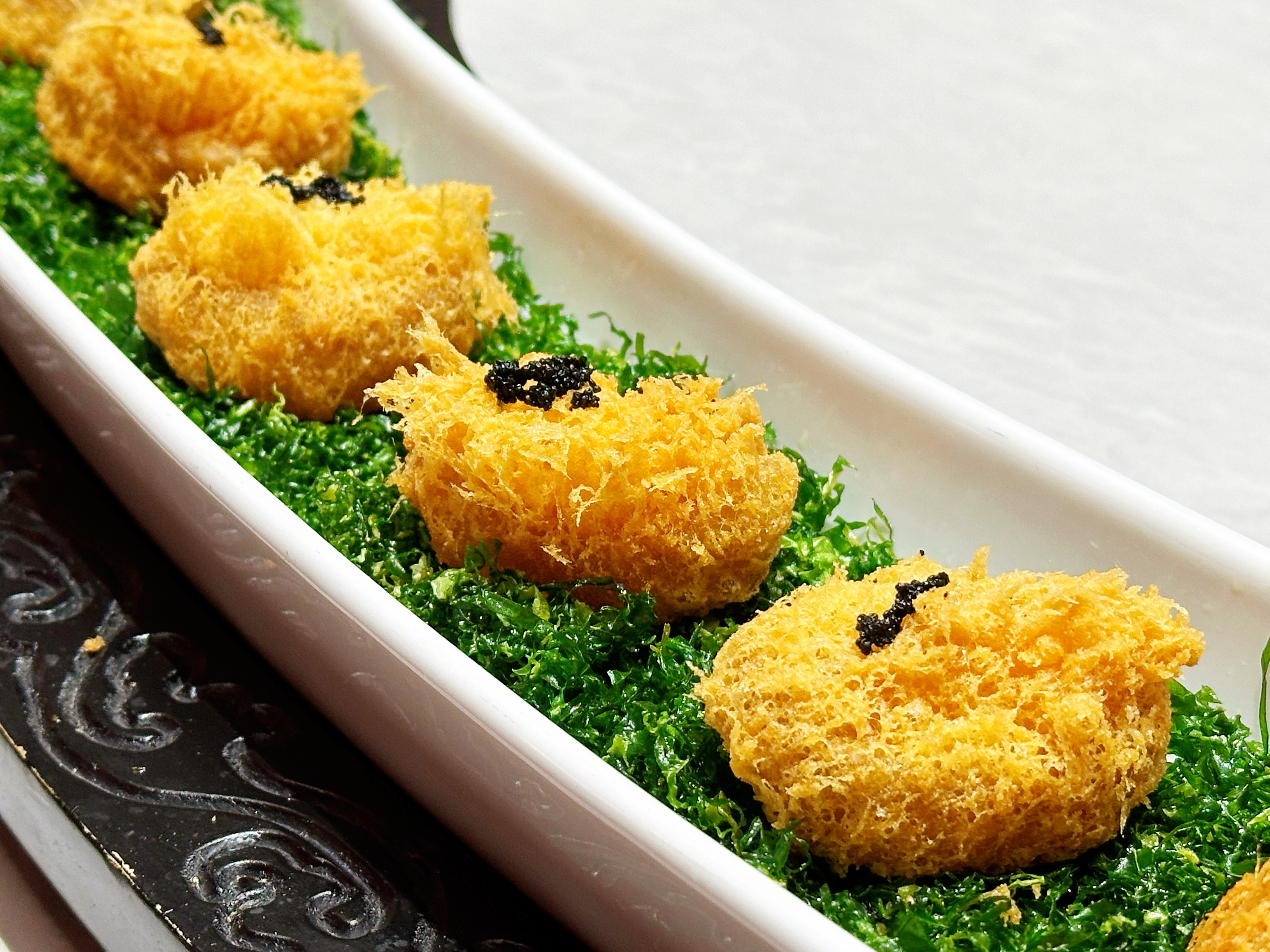除了这些招牌菜之外,餐厅还有许多其他美味的海鲜融合菜。比如蜂窝鲍鱼,鲍鱼被制作成蜂窝的形状,外皮酥脆,内里鲍鱼Q弹嫩滑,酒香浓郁,咬下去还有些许汁水迸出,口感层次丰富。