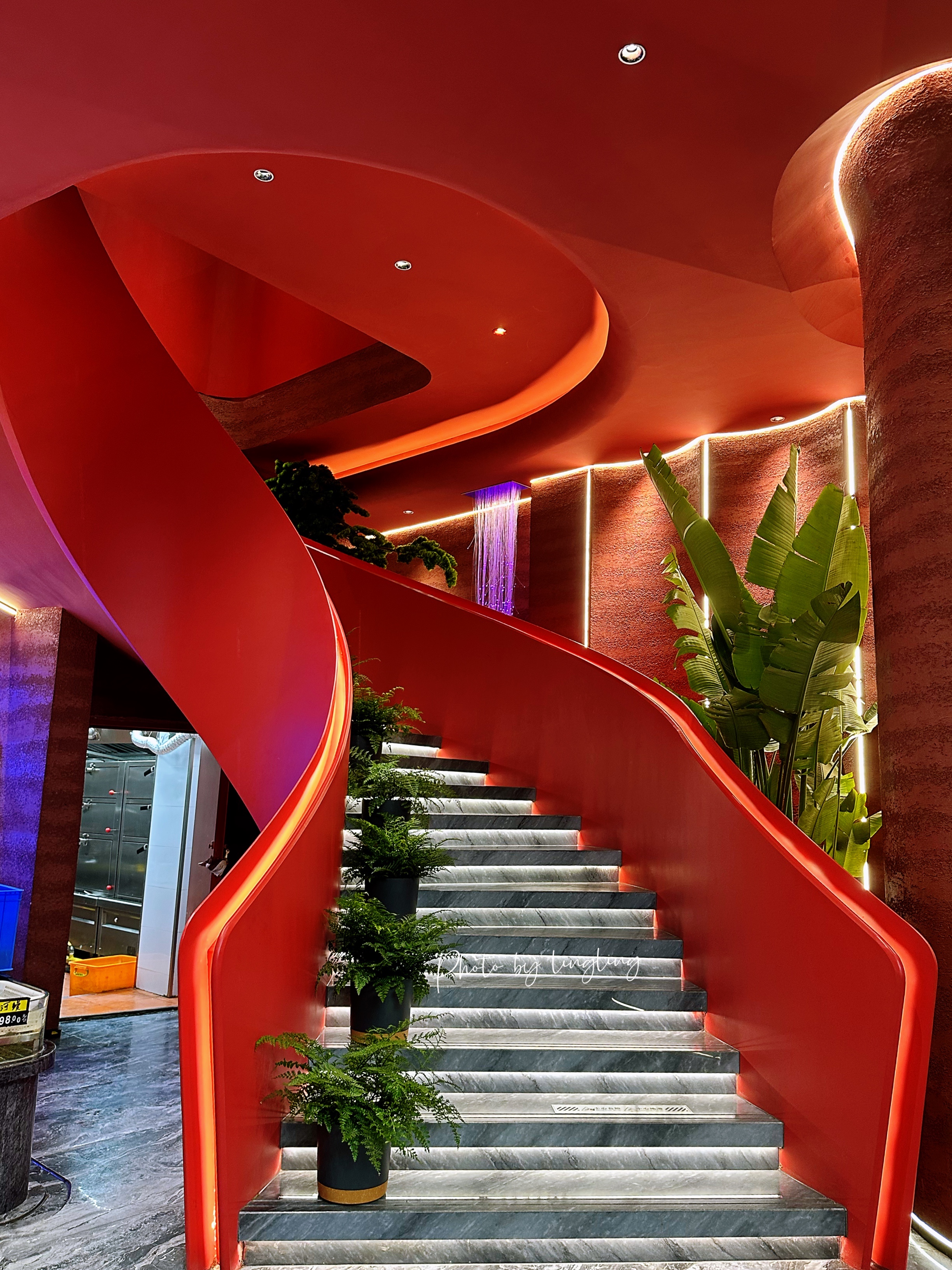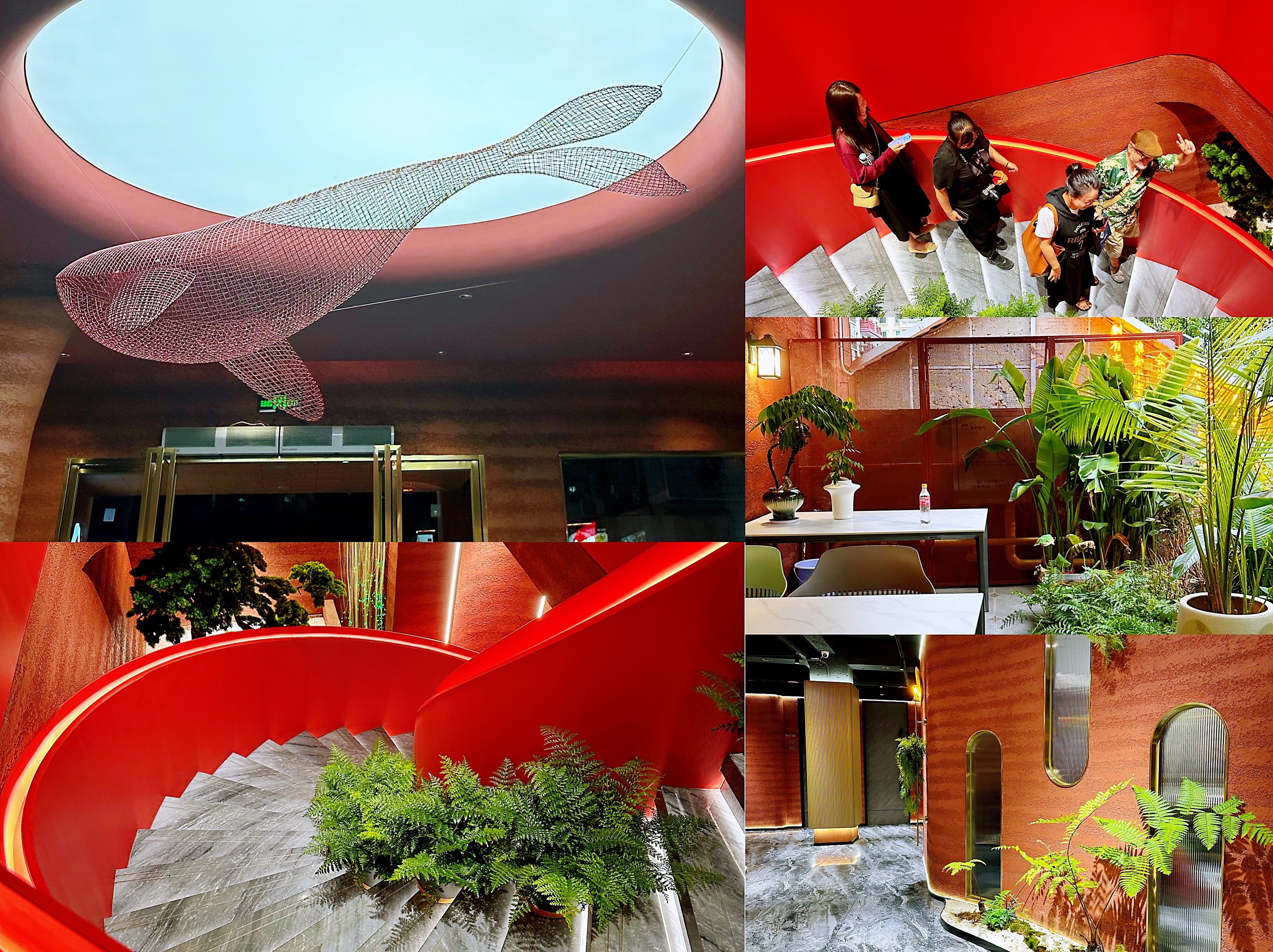 而餐厅一楼的大鱼海棠土楼设计,更是让人仿佛置身于一个梦幻般的世界。从一楼到二楼引人注目的网红旋转楼梯。这座楼梯设计独特,仿佛一条优雅的红色锦鲤,引领着食客们步入美食的殿堂。楼梯的每一层都装饰着郁郁葱葱的绿植,让人在攀爬的过程中也能欣赏到自然的美妙。