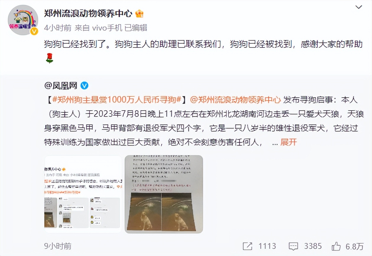 7月9日,一张“悬赏1000万人民币寻狗”的寻狗启示引发郑州市民广泛关注。