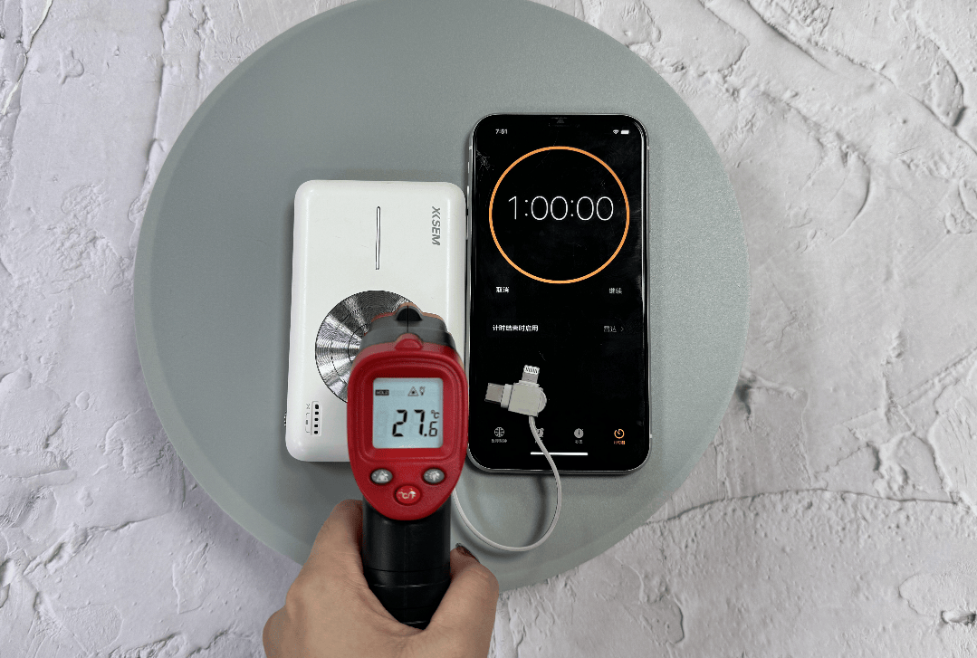 →测评方法:为精准评估三款充电宝的控温及散热能力,模拟长时间高强度充电工况开展测试。采用专业温度传感器对充电宝机身关键区域进行实时温度采集,结合量化数据与体感反馈综合判定散热效率。同步记录快充全程的运行状态,重点观察是否出现异常温升、自动断电等影响使用安全性与稳定性的现象。