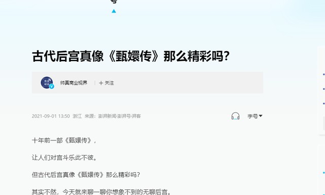 信息来源 古代后宫真像 湃客:帅真商业视界 2021-09-01 13:50 古代后宫真像《甄嬛传》那么精彩吗?