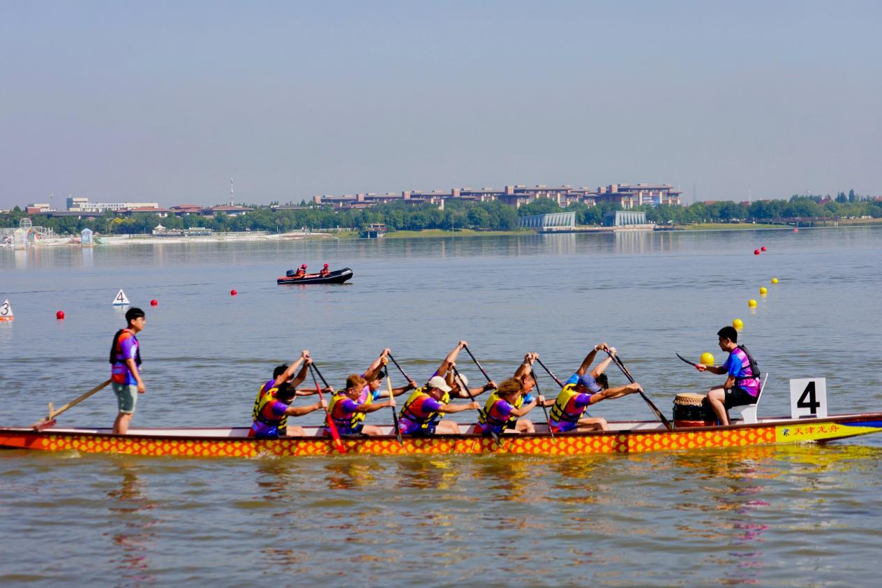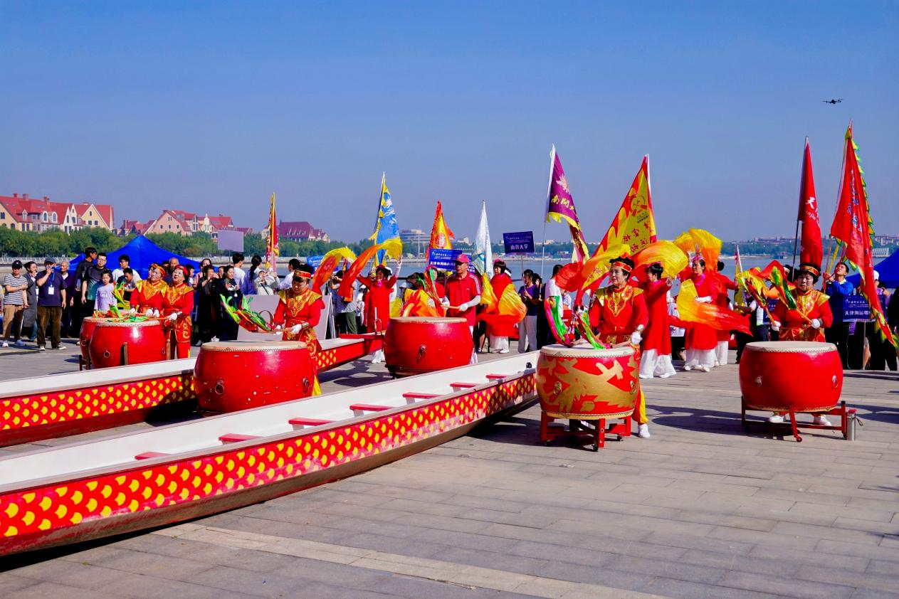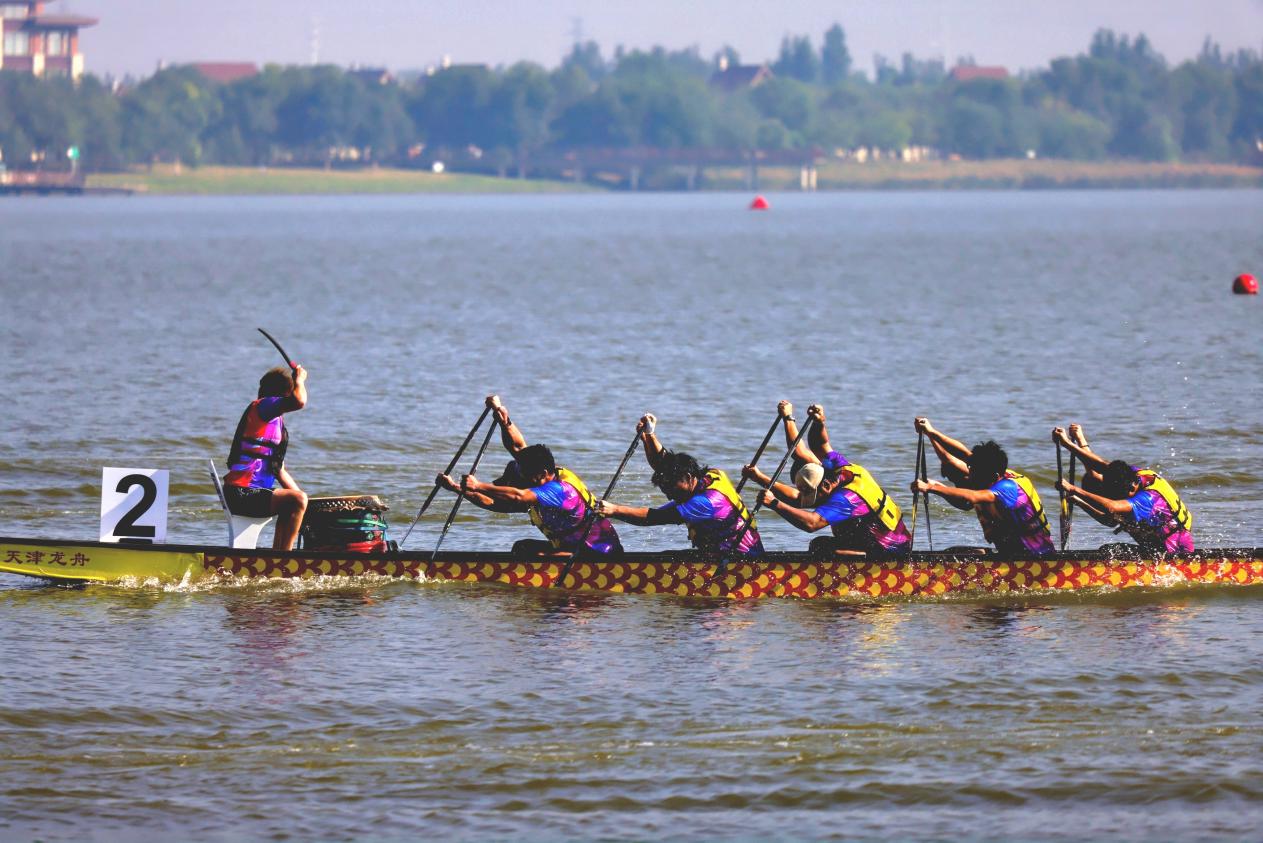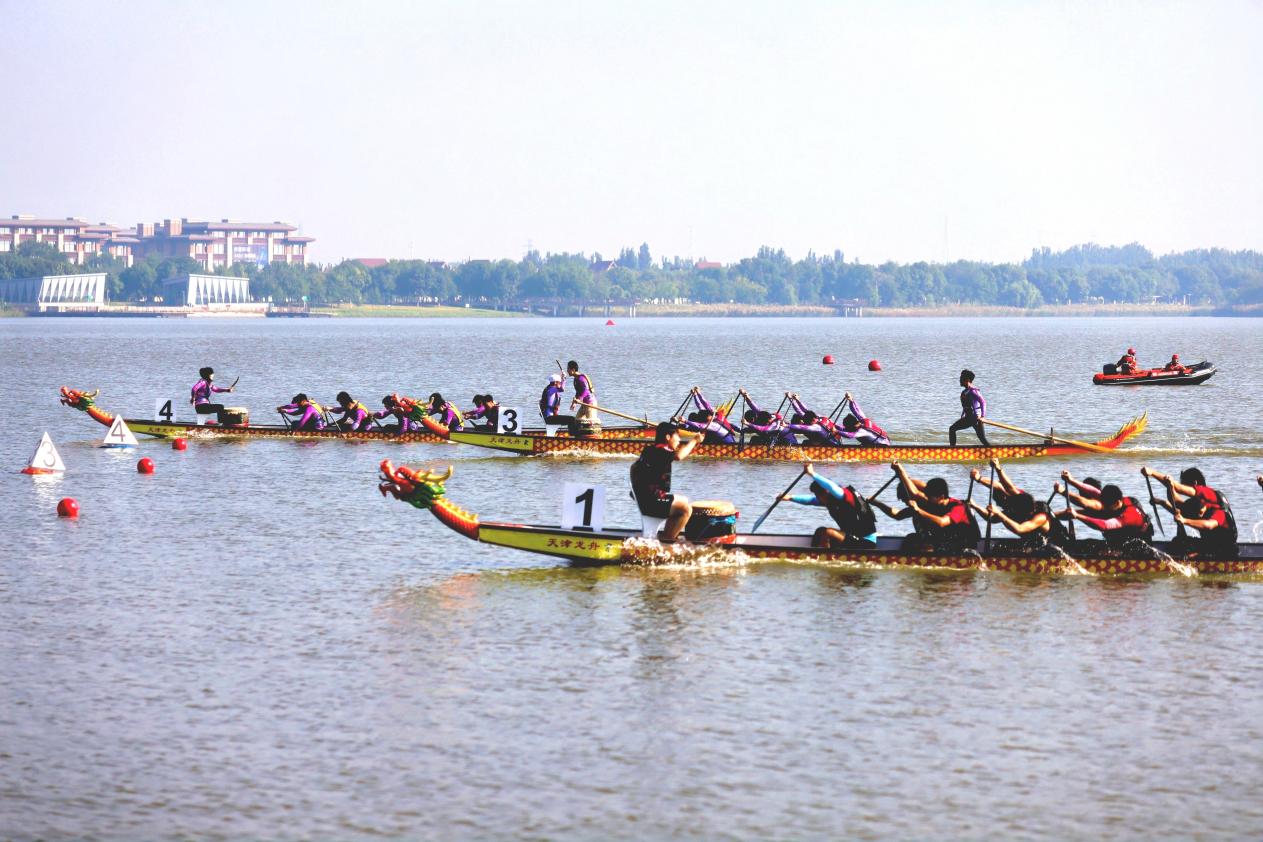 随着发令枪响,鼓点铿锵震南湖,龙舟如离弦之箭在水面飞驰,飞溅的浪花与岸边摇曳的芦苇相映成趣,勾勒出“百舸争流逐碧浪,津门金秋竞风流”的壮阔画卷。