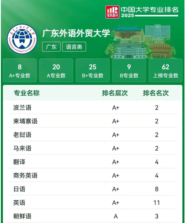 而这份培养逻辑,也让广外的涉外王牌专业在全国专业排名中脱颖而出,2025年榜单中,波兰语、翻译、马来语等外语类专业斩获A+评级,朝鲜语、德语获评A+,33个外语语种的布局让其成为华南地区外语语种最多的高校,为涉外交流筑牢了坚实的语言根基。