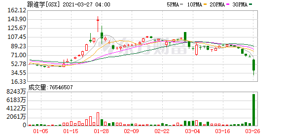 隔夜腾讯音乐,唯品会,百度止跌,爱奇艺继续下挫。但跟谁学单日崩盘,一度跌近56%,尾盘稍有拉升,收于39美元,下跌41.57%,最新市值仅剩99亿美元,距今年1月末的股价历史最高点下跌73.8%,市值蒸发187亿美元。