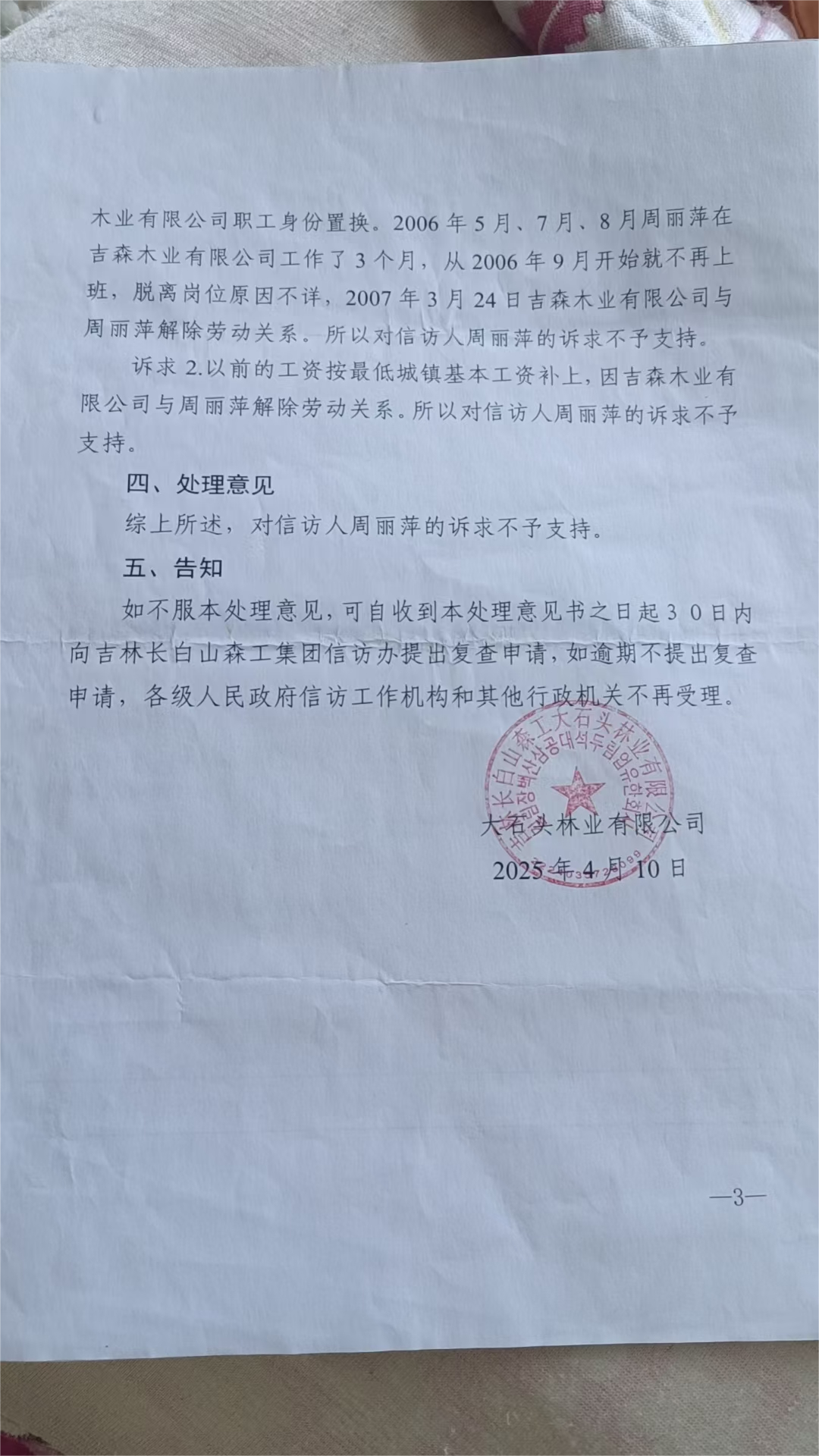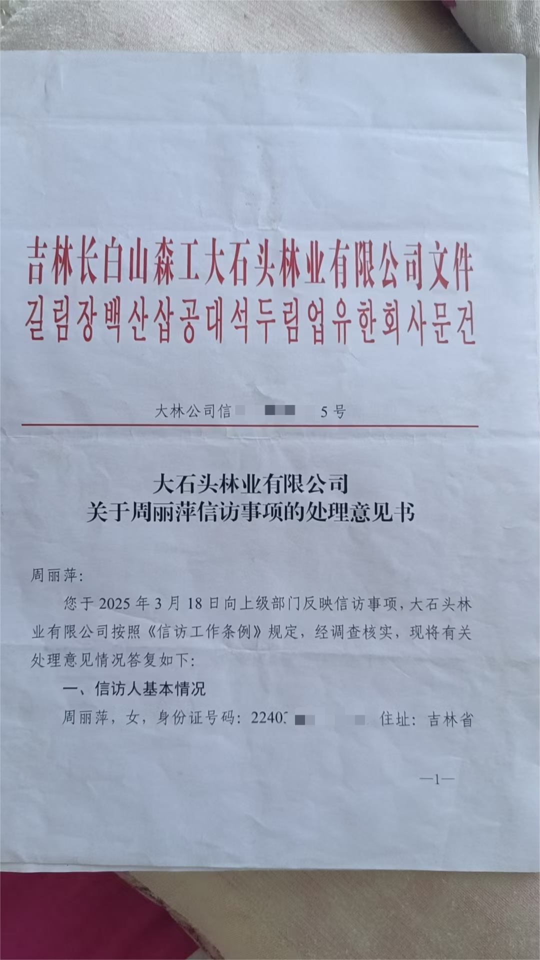 2004年9月,周女士通过吉林省敦化市大石头林业局与延边林业学校联合举办的中专班入学,招生时明确约定“毕业后录用为全民合同制职工”。然而,2007年实习结束后,周女士与同批30名同学多次向林业局申请分配工作未果,至今未能实现就业承诺。如今,她希望通过媒体发声,呼吁相关部门依法维护劳动者权益。周女士回忆,当年入学时,林业局工作人员明确表示:“学习两年、实习一年,共三年后安排工作。”2006年,林业局将她等30人统一安排至私营企业敦化市吉森木业有限责任公司实习。实习结束后,林业局却以“已分配至吉森木业”为由拒绝提供合同制岗位。周女士强调,吉森木业为私营企业,与“全民合同制职工”的身份承诺不符,且实习期间未签订任何劳动合同。据周女士提供的《处理意见书》显示,周女士实习完之后,大石头林业局未与周女士签订就业劳动合同,未履行招生安排协议书合同。她指出,同期入学的60名学生中,另30人获得岗位,而周女士30等人被排除在外。这一差异待遇令周女士感到不公。2004年、2005年,国家信访局两次受理了周女士的上访,转交,督办到地方,地方拒绝执行国家信访局督办的信访事项。周女士表示,林业局在答复中回避核心问题,仅以“已分配至私企”一笔带过,却未提及合同违约及社保补缴等关键诉求。