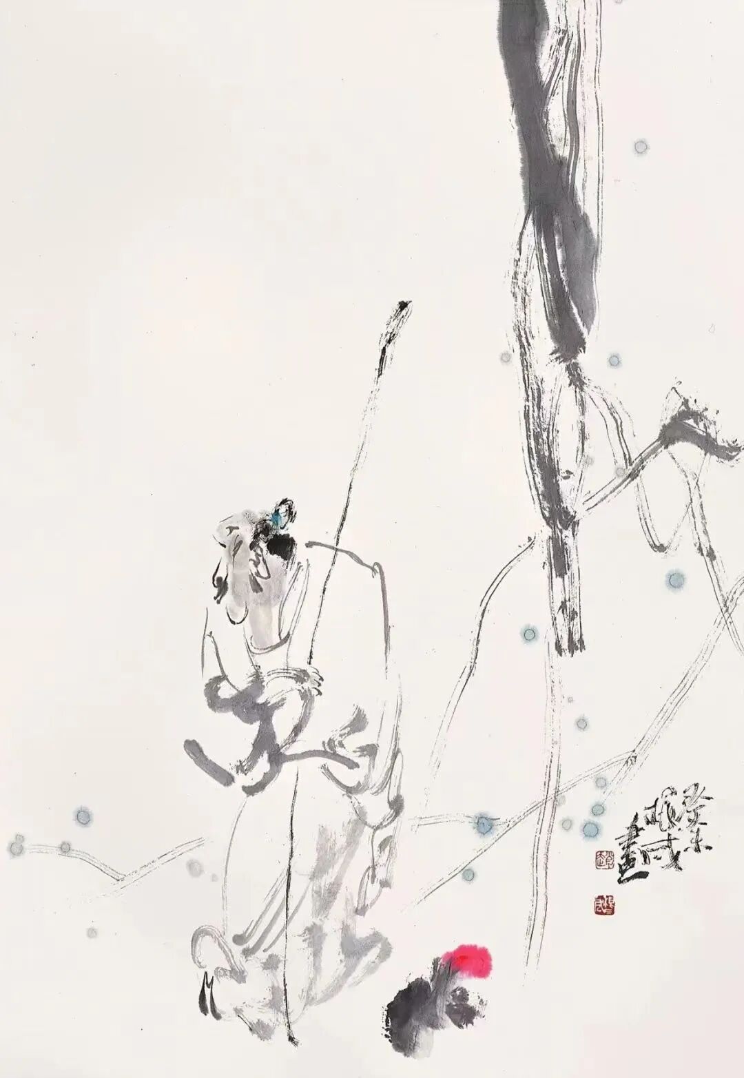 根成先生的画,由能而妙,由妙而神,由神而近乎逸,一路攀援,台阶而进。他早年曾专事工笔,其《白圭造像》、《夜读春秋》、《东坡品茗图》等工笔画,足见用心之精,功夫之深。这为他后来从事写意画的创作打下了坚实的基础。本人认为,能品是中国画的基础,也是中国绘画艺术的门径。不能而求妙品、神品、逸品是不由门而欲登中国艺术之殿堂,非钻穴打洞而不可得,难免陷入怪诞之途,而仅守于能品,或以能品为能,则难成大器,终也画匠而已矣。