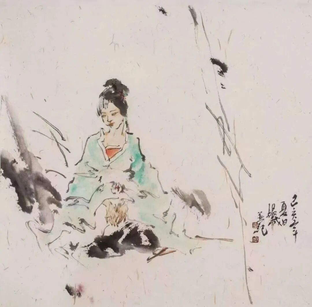 以行显心,以势传神,注重人物精神世界的刻画是根成先生画人物画的重要特点。赵根成先生的扇形画也别有高致。《清风故人》、《秋风》令人回味。尤其是《清风故人》无论从气氛的渲染,还是画面的布局,或是人物内心世界的刻画,都达到了“然,不知其索然”之意境。高士想见,故人促膝相谈,清风淡月,似有说不完的知心话,直令吾人欲侧期间听之,然而又怕惊扰了两位高士,破坏了此处的雅静。画至此境,已不能言说,最好沉默。