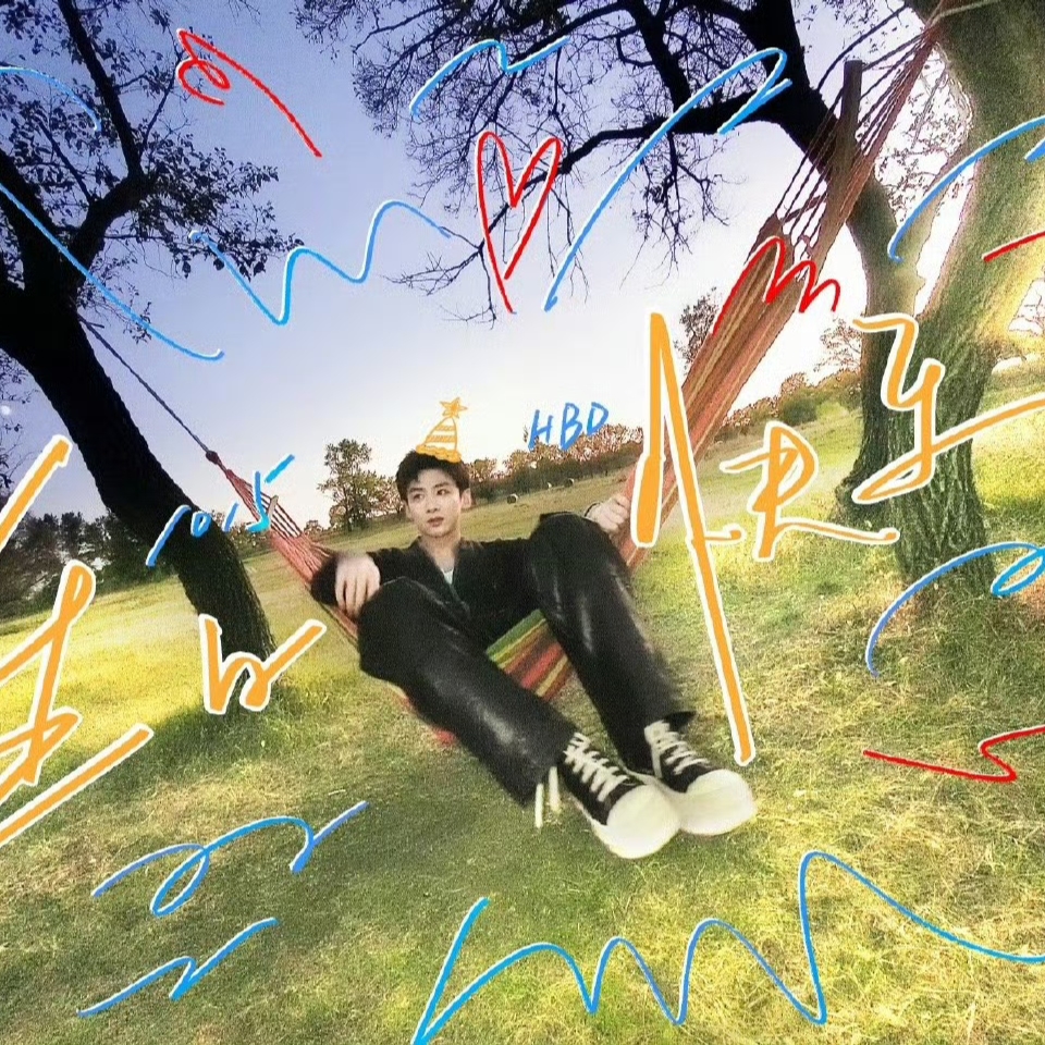 而另一张照片更是直接展现了生日氛围。头戴黄色星星生日帽的白敬亭,一身黑色装扮悠闲地躺在吊床里,身后是涂鸦风格的"生日快乐"和"HBD"字样。红蓝色线条与心形图案交织,充满童趣与活力。最特别的是吊床场景与窗前品茶的画面形成鲜明对比——一面是安静内敛的沉思者,一面是童心未泯的大男孩,这种反差恰恰构成了一个完整的白敬亭。