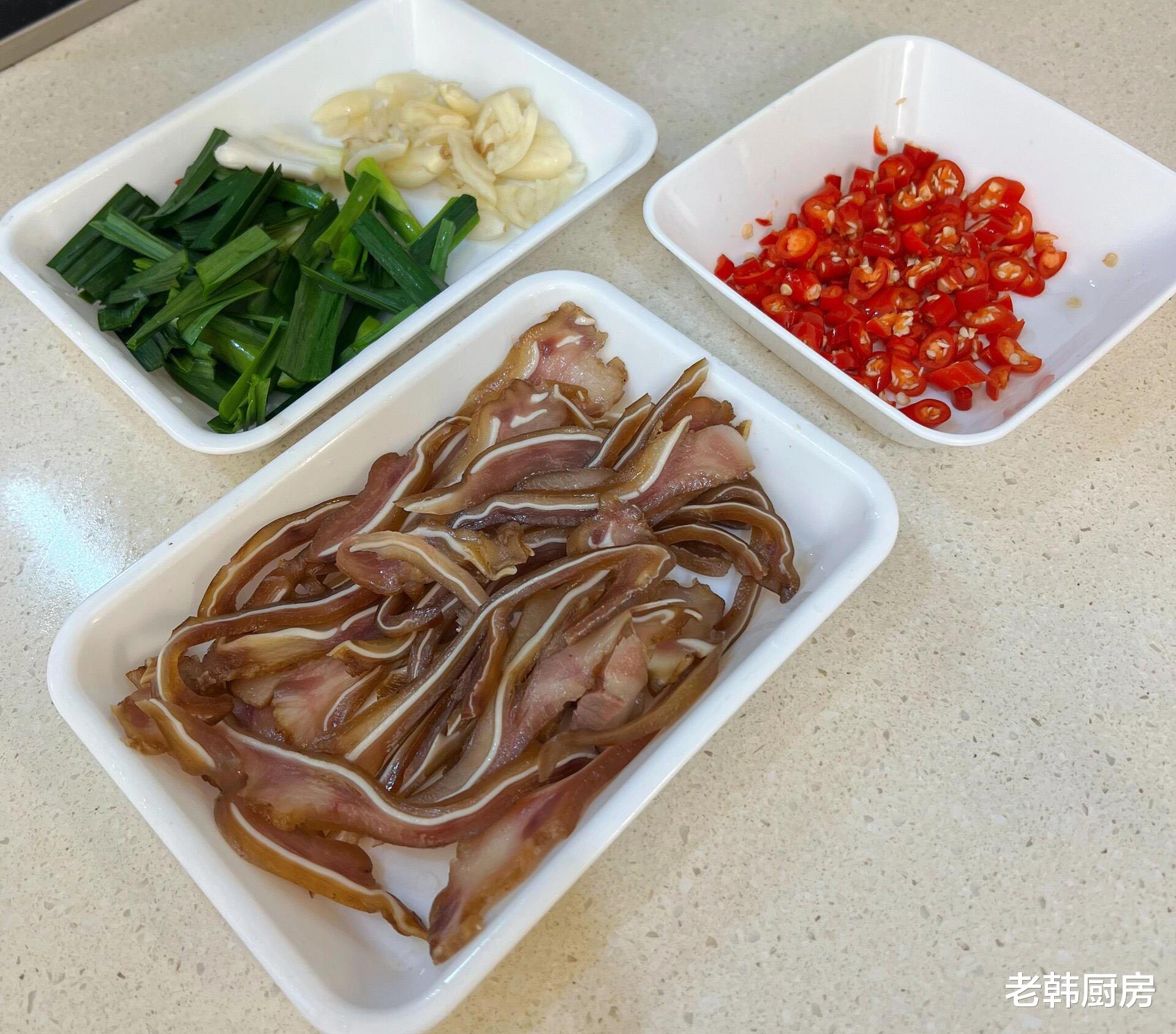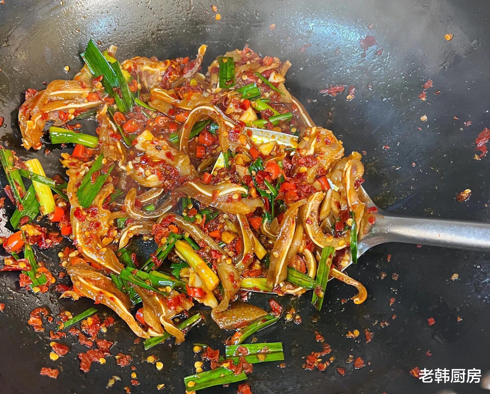 (小贴士:卤猪耳选带点软骨的更脆,干辣椒剪段前用温水泡5分钟不易炒糊,蒜苗白绿部分分开切)