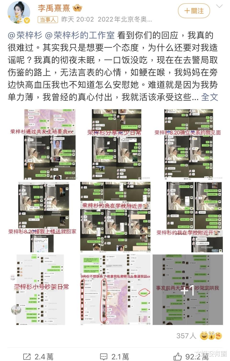 这件事,还得从10月15日李禹熹的悲情控诉说起。当时,这位自曝与荣梓杉相恋三个月的女孩,不仅晒出了两人亲密聊天的对话记录佐证恋情,还爆料了遭遇荣梓衫冷暴力与多次出轨的对待。
