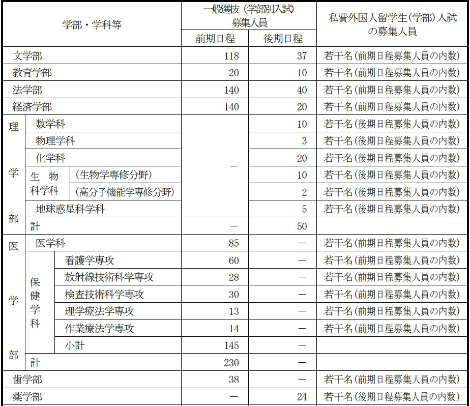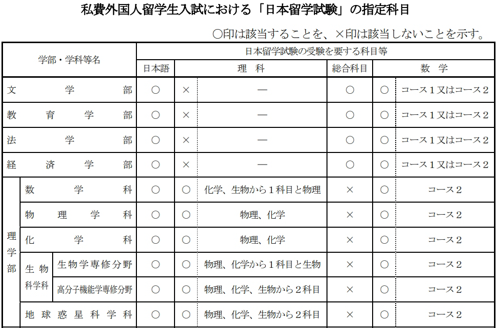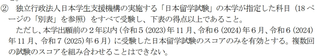 认可2023年11月、2024年6月、11月和2025年6月的留考成绩。各学部具体留考科目要求如下:文学部、教育学部、法学部、经济学部要求提交EJU日语、文科综合、数学1或数学2的成绩。理学部、医学部、齿学部、药学部、工学部、农学部、兽医学部、水产学部要求提交EJU日语、数学2和理综成绩。