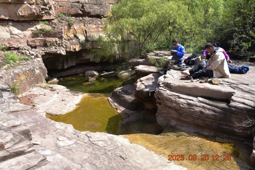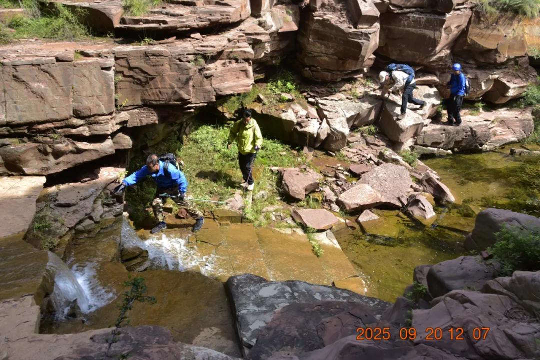 爬上来的大家放松一下紧张的心,顺便吃点东西, 一路过来 路难点不少,现在都不敢想着原路返回,原路返回也不容易,只能咬牙继续挑战,想的至少越往上游,水会越来越小。