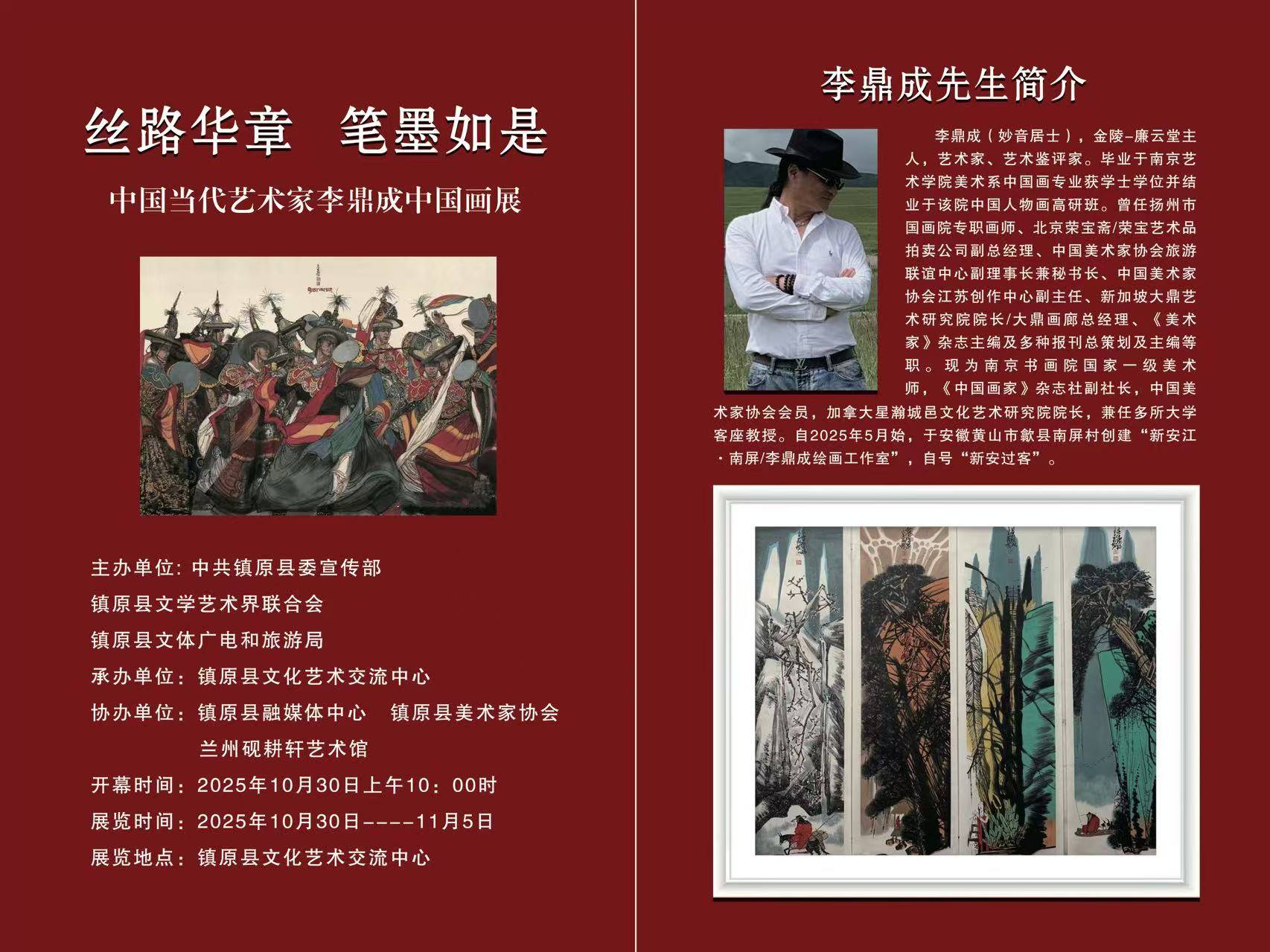10月30至11月5日,《中国当代艺术家李鼎成中国画展》应邀在甘肃省“镇原县文化艺术交流中心”举办。此展由中共镇原县委宣传部、镇原县文学艺术界联合会、镇原县文体广电和旅游局联合主办,镇原县文化艺术交流中心承办,镇原县融媒体中心、镇原县美术家协会、兰州砚耕轩艺术馆协办。共展出当代艺术家李鼎成各类作品70余幅。