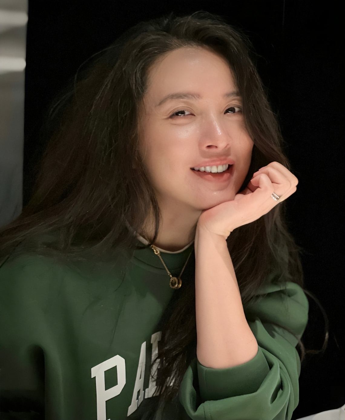照片中,李佳披着长发,身穿绿色卫衣,单手托腮,脸上绽放出灿烂笑容。