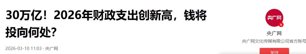 央广网2026-03-10:《30万亿!2026年财政支出创新高,钱将投向何处?》