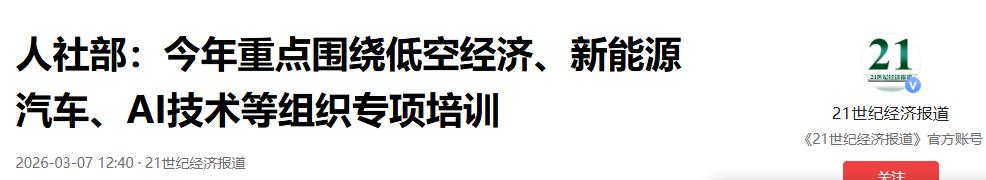 世纪经济报道2026-03-07:《人社部:今年重点围绕低空经济、新能源汽车、AI技术等组织专项培训》