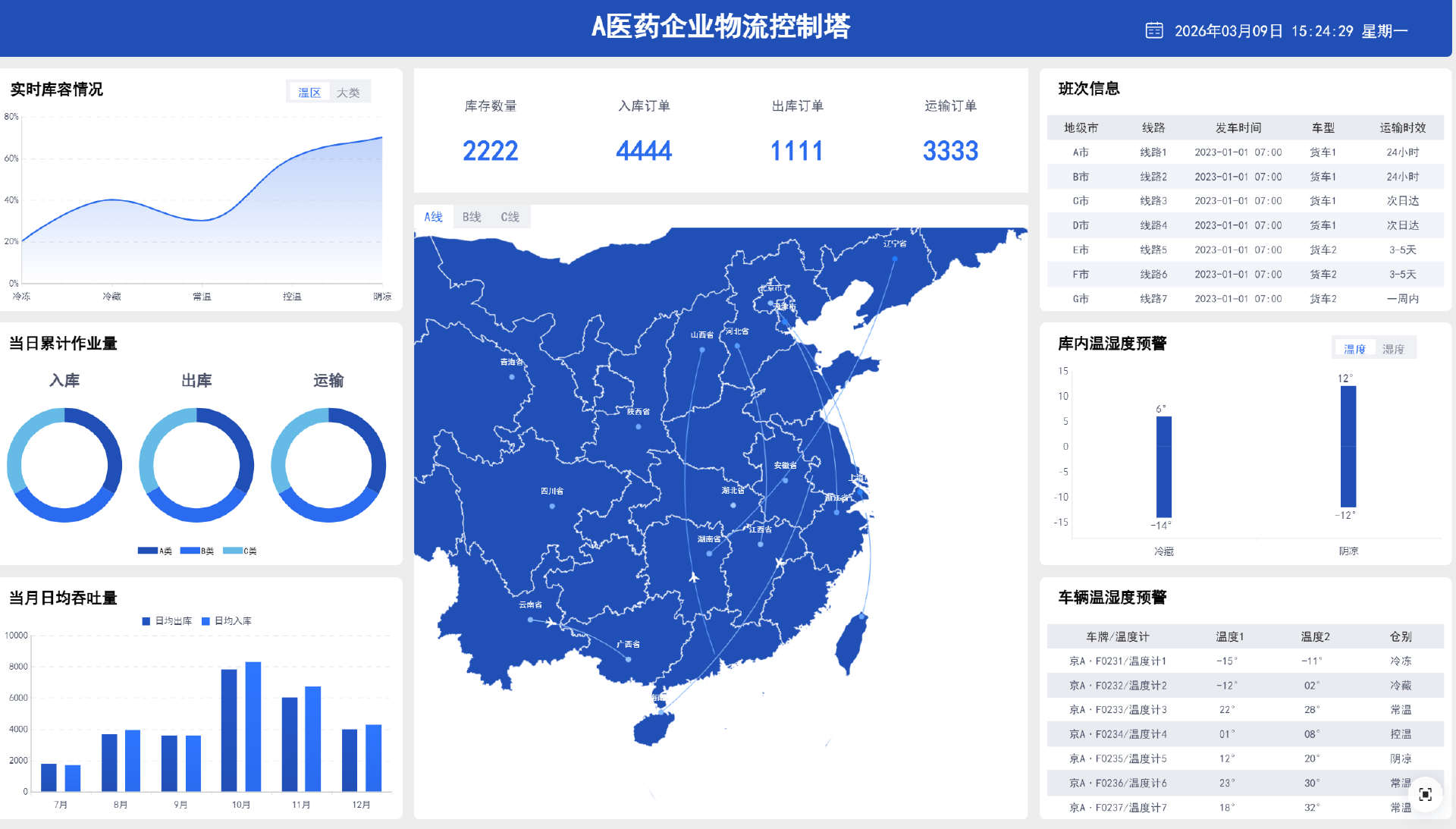 医药冷链温湿度合规预警,实时监控库内与运输车辆温湿度,异常及时预警,确保药品质量安全。