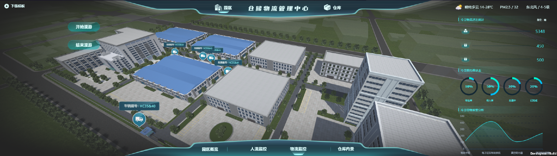 仓储物流管理中心包含园区概览、人流监控、物流监控、仓库四个部分,可以用作园区的展示与监控,帮助经营管理人员提高管理的效率,实现全方位动态管理。