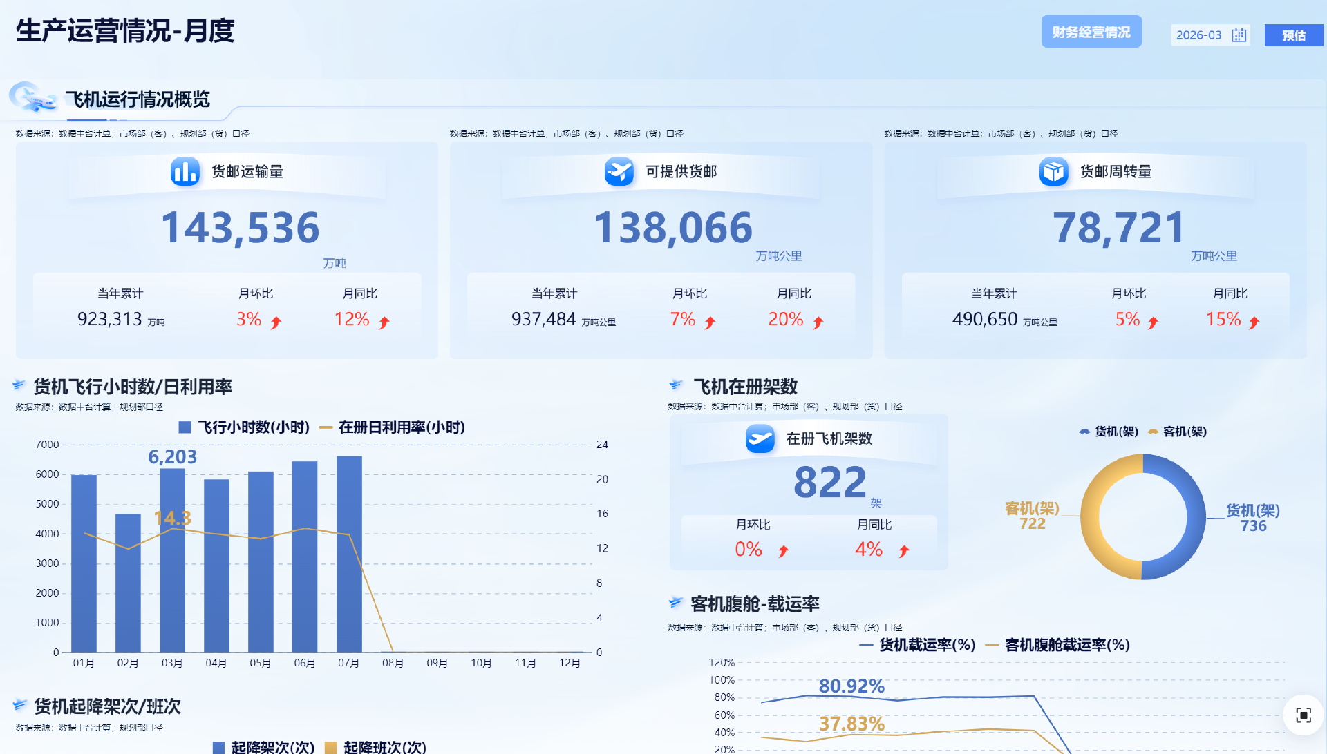 飞机运力与运营效率评估,焦货邮运输量、可提供货邮、货邮周转量,分析运力效率与载运管理,优化机队规划与运力调度。