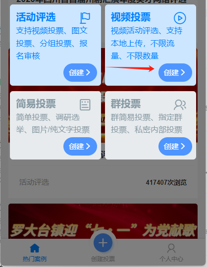进入到活动主页后,点击“创建投票”按钮,选相应的模版,视频投票活动直接点击“视频投票”模块,支持300M大容量视频作品。