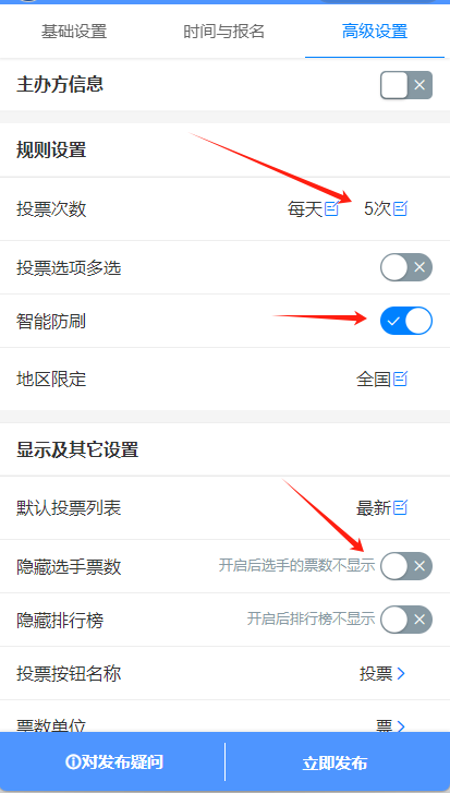 在高级设置里面,需要配置投票规则,可以设置单选或者多选,如每人每天限投5票,启动防刷机制,必要匹配上区域IP地址限制,可以有效防止刷票的行为出现。