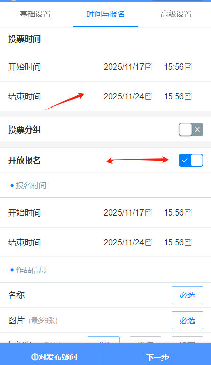 投票起止日期设定、自主报名模式及分组按需求设定(自主报名的视频需要活动发起者审核通过后展示)