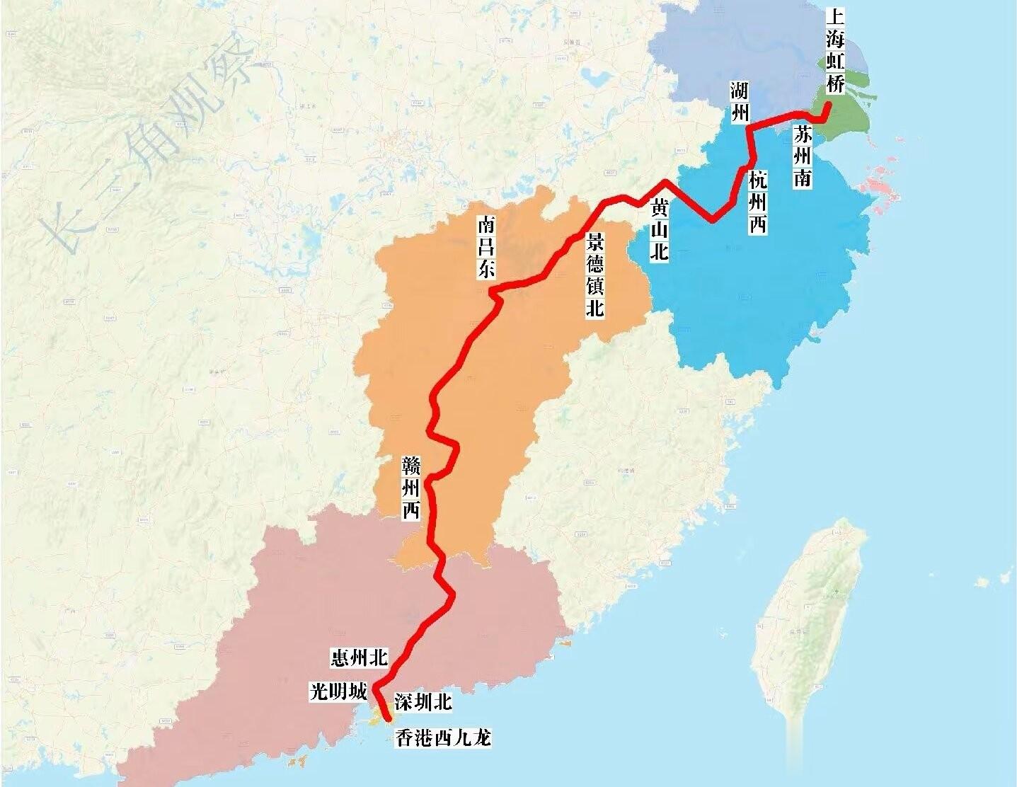 这条高铁,是从上海虹桥,向西经过南京、合肥和武汉之后,再向南转向京广高铁,经长沙、广州、深圳之后抵达香港。
