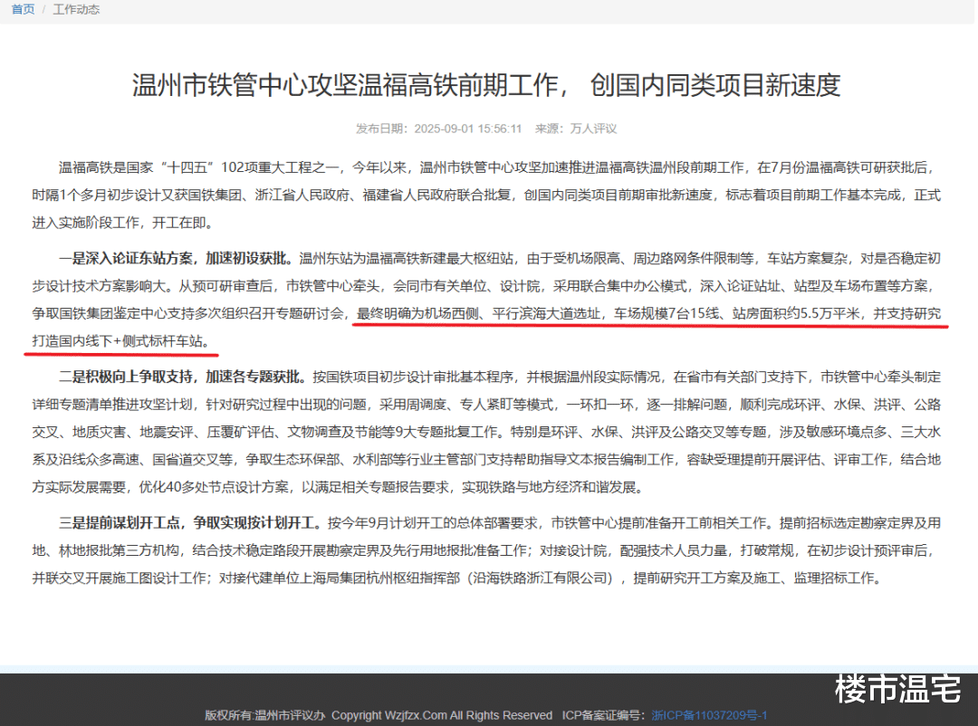 首先,温州东站明确为机场西侧、平行滨海大道选址。这一点,从去年发布的工程用地预审与选址批前公示,就能看出。