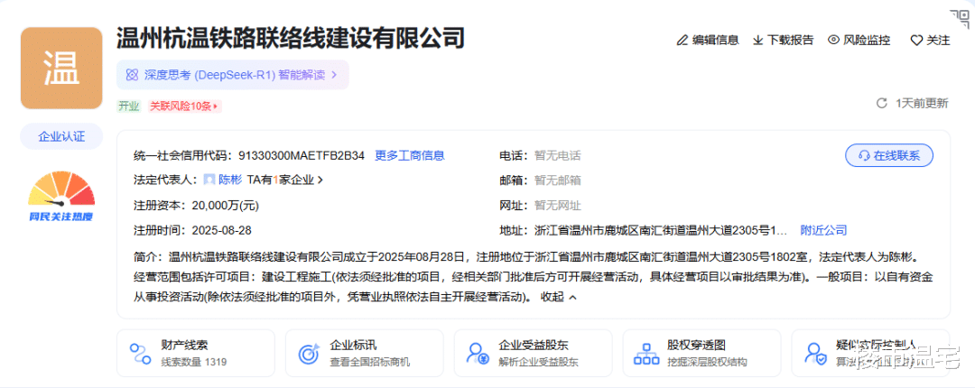 同时,日前温州杭温铁路联络线建设有限公司成立,由市铁投集团等共同持股,经营范围涵盖建设工程施工、以自有资金从事投资活动等,为项目的顺利实施提供了坚实的组织保障和资金支持。