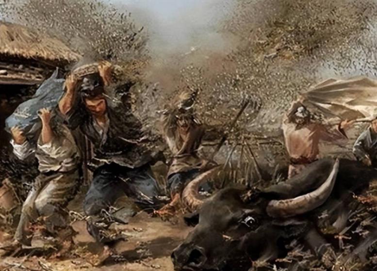 来年春夏,铺天盖地的蝗群如黑云般席卷而来。