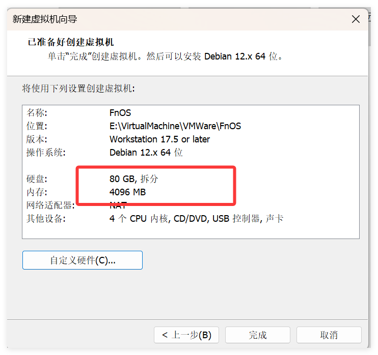 此处默认给的3核和2G内存,点击“自定义硬件”进行修改,修改为 4G 和4核,同时挂载刚才下载的飞牛OS镜像,修改后如下: