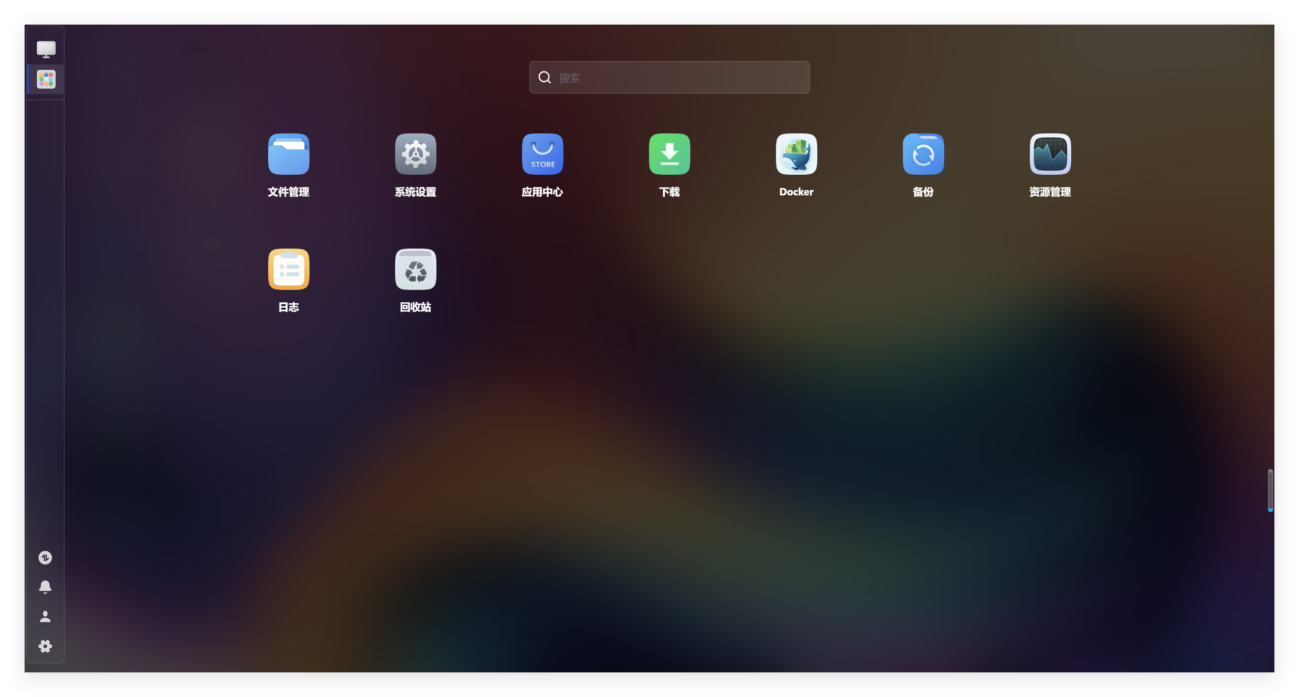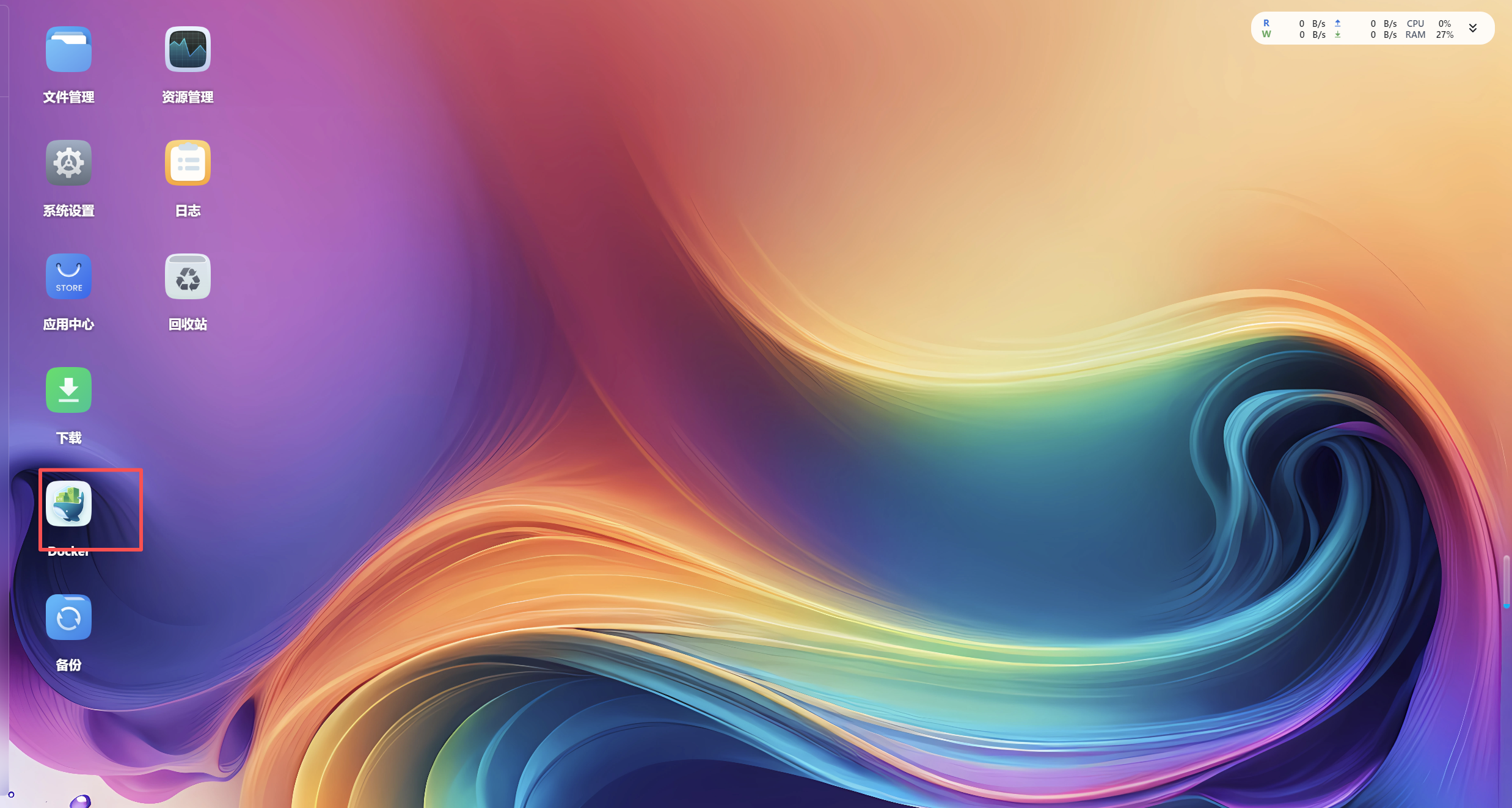 桌面为存放常用应用或快捷方式,如:文件管理、应用中心、Docker 和回收站等: