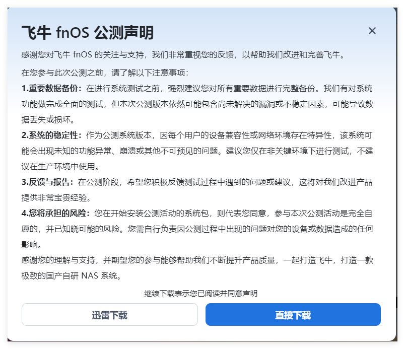 在官网首页点击“下载fnOS”后会弹出下载声明: