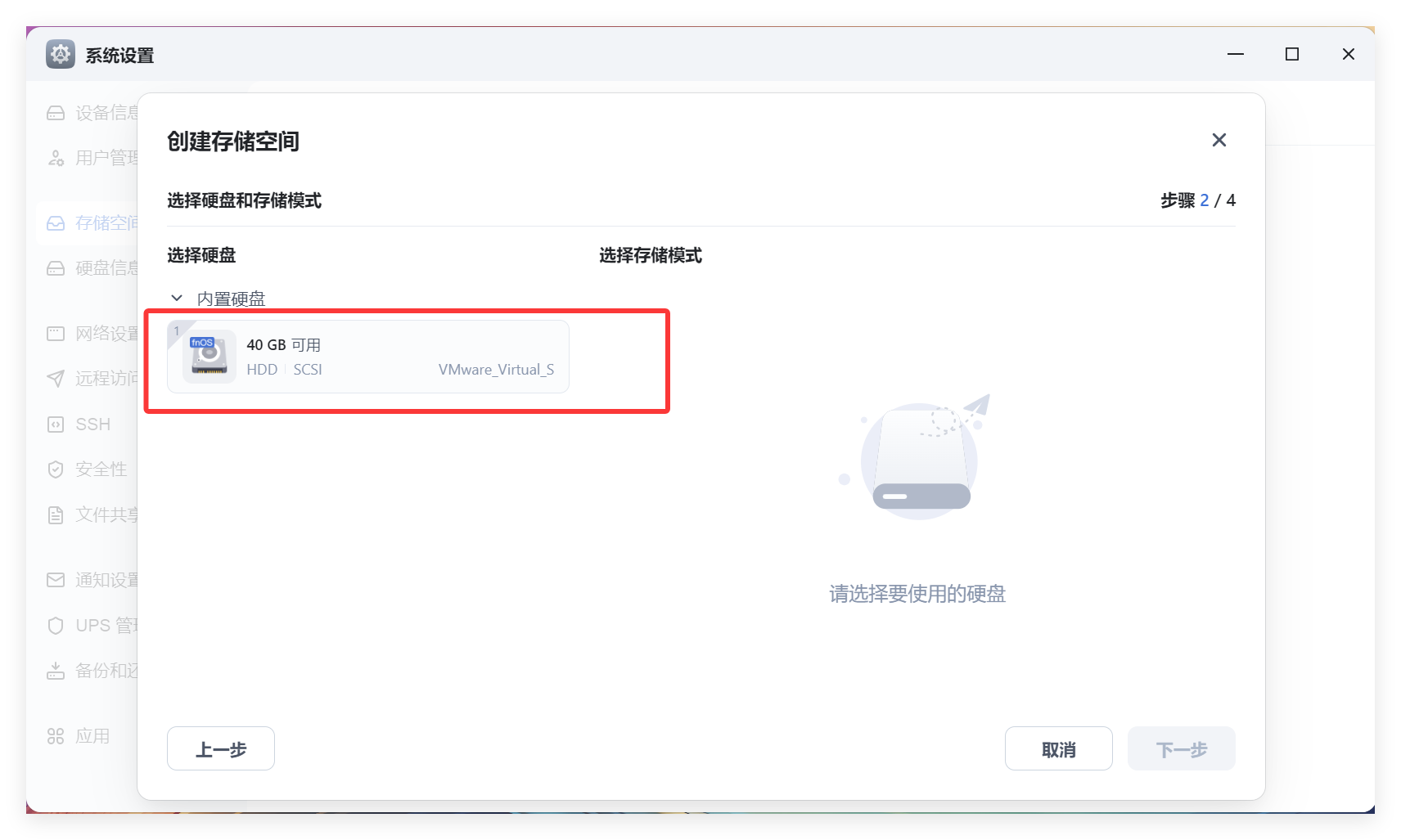 选择唯一可用的硬盘(虚拟机只分配了一块,正常的NAS中可能多块),然后开始选择存储模式: