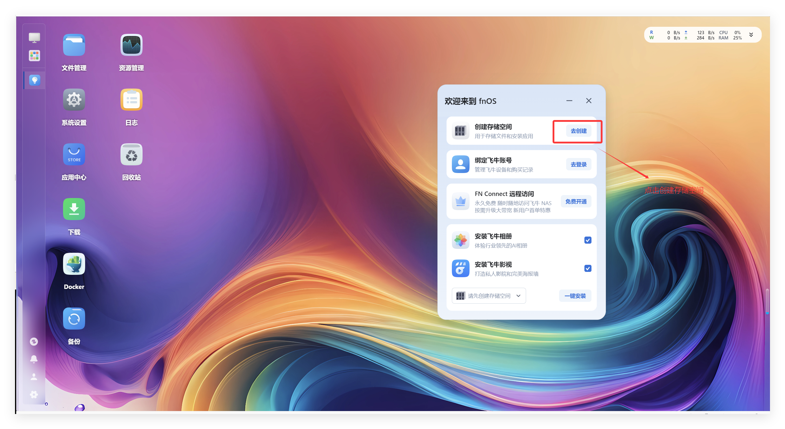 刚登录系统时会有一个欢迎窗口,里面包含常用的安装应用以及创建存储空间选项: