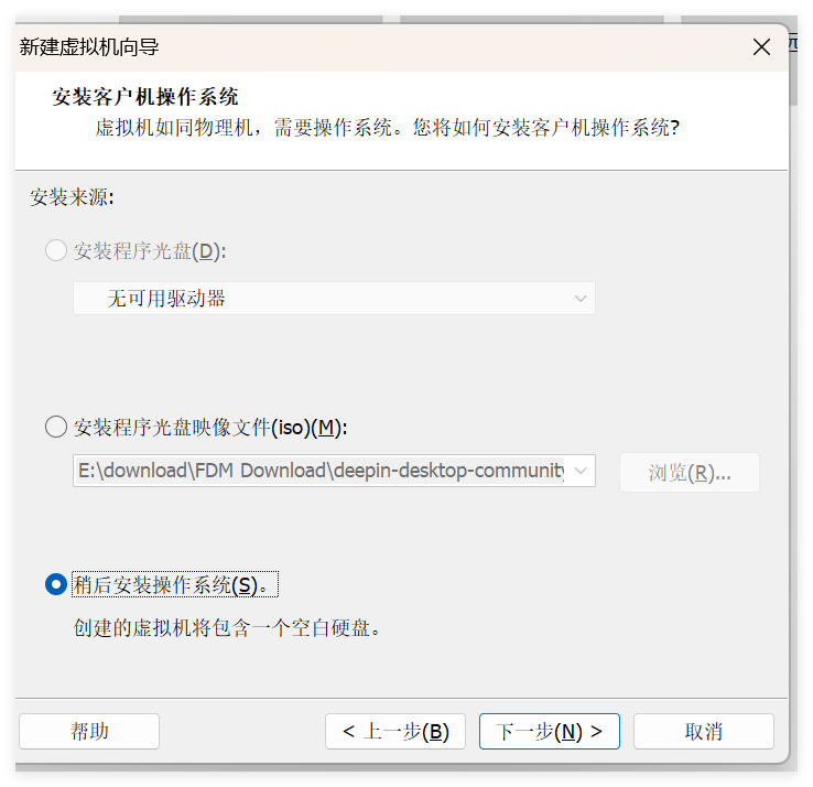保持默认的“稍后安装操作系统”,继续“下一步”开始配置客户机操作系统: