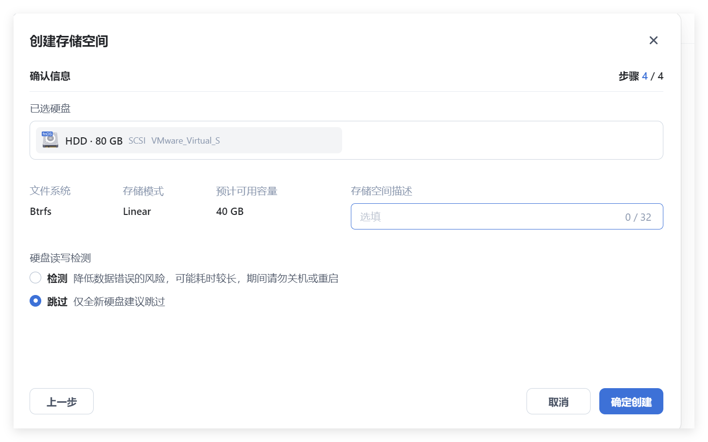 存储空间描述为选填,我这里不填写,直接“确定创建”,之后弹出硬盘格式化确认要求: