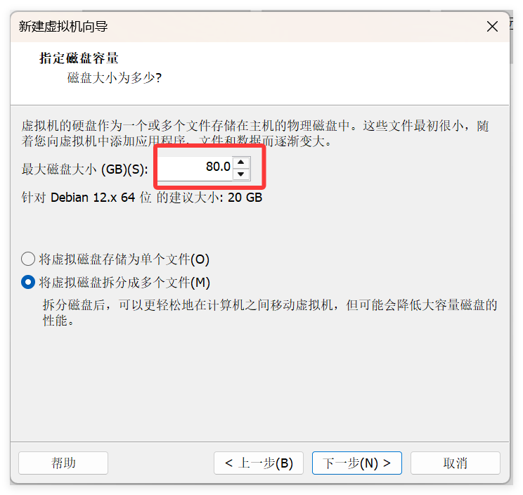 接着“下一步”开始配置虚拟机的磁盘信息: