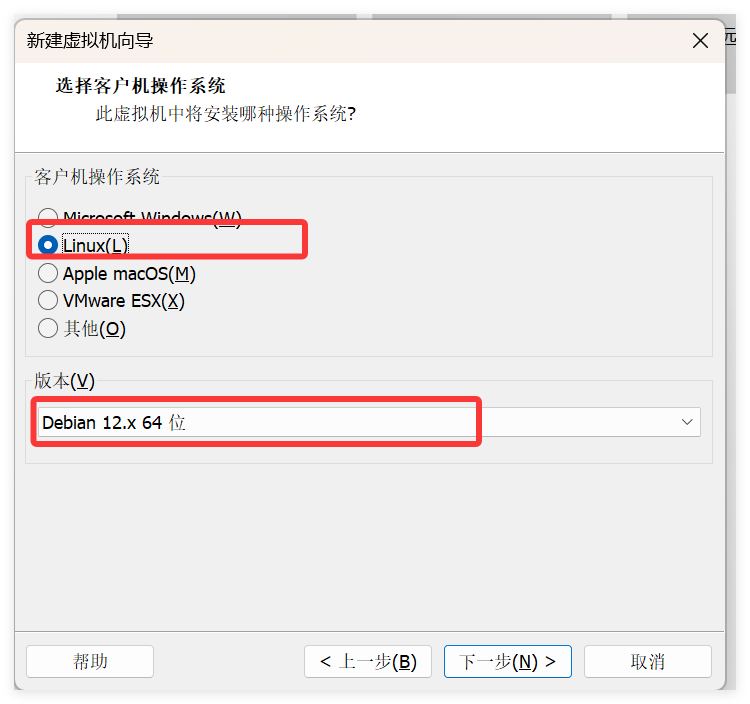 之前讲过, 飞牛OS基于 Debian 开发,因此此处的客户机操作系统选择 Debian,版本选择 Debian 12.x64,选好后继续“下一步”开始配置虚拟机名称和安装目录: