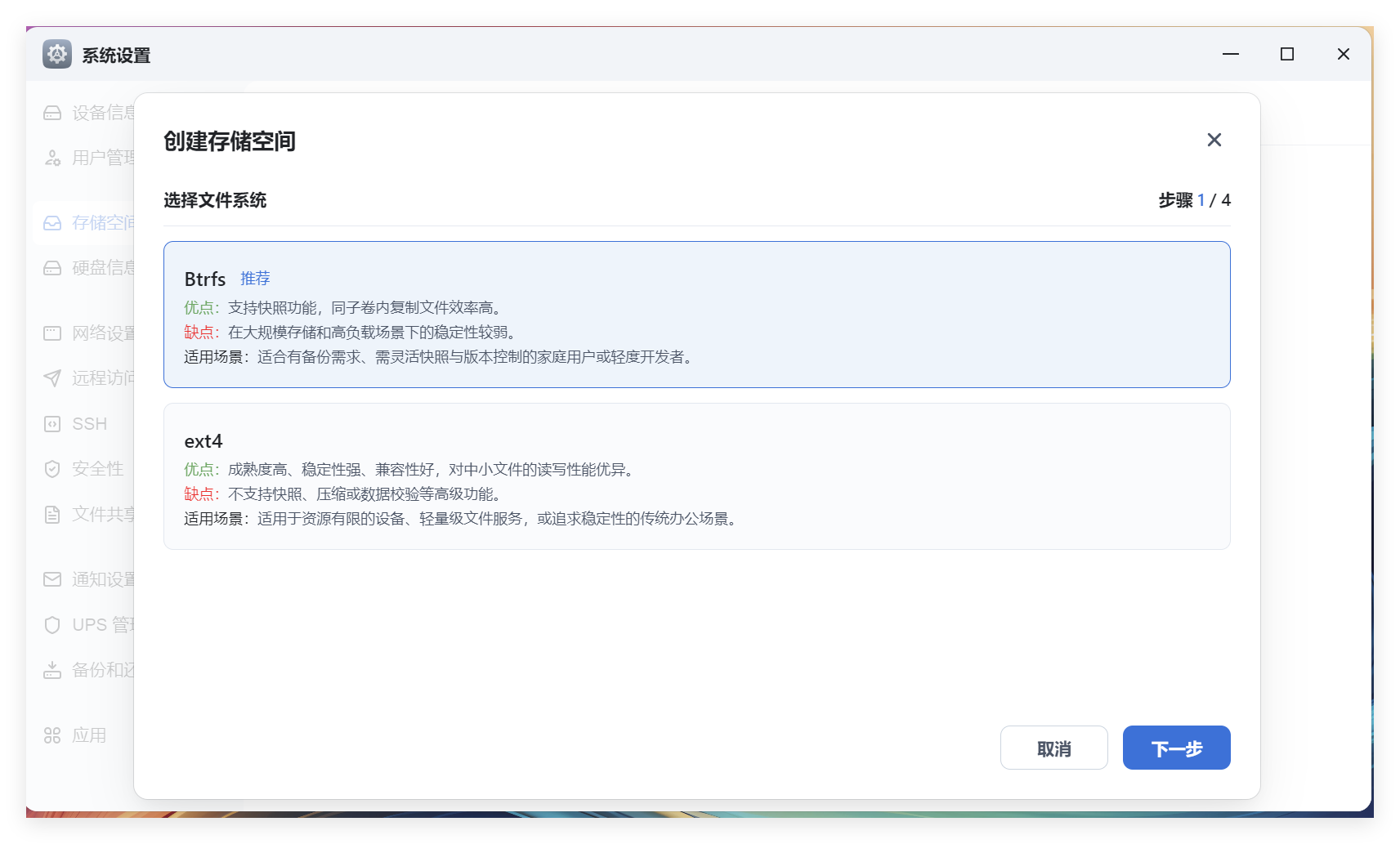 这里看自己需求,不过我是在虚拟机中体验,直接默认的 Btrfs即可,点击“下一步”: