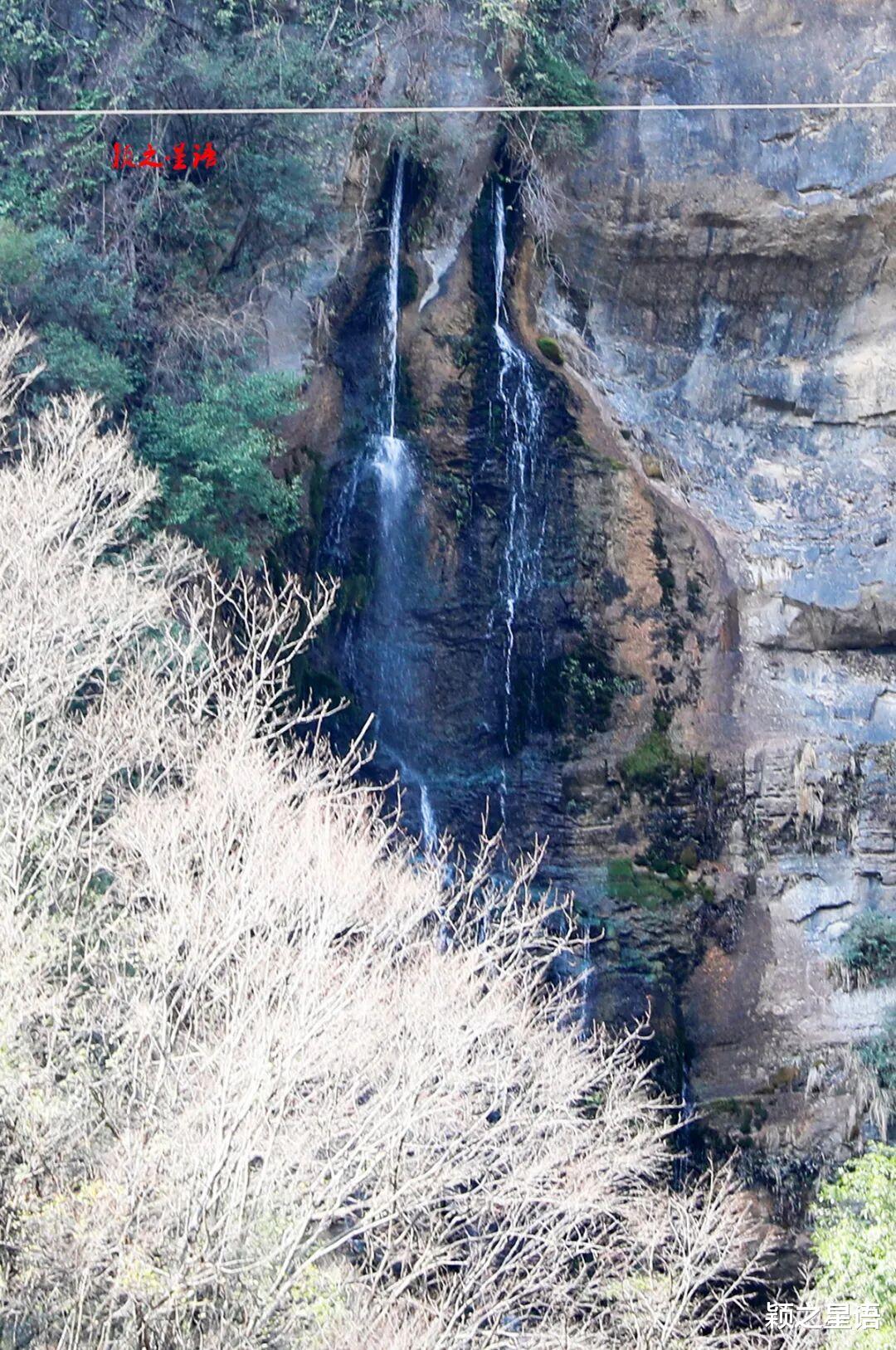 对岸的悬崖绝壁上,有溶洞和暗河,两个石洞中有水流出来,坠落而下,形成了双瀑直下的奇特景观,人称双鼻孔,大自然之造化,神奇!